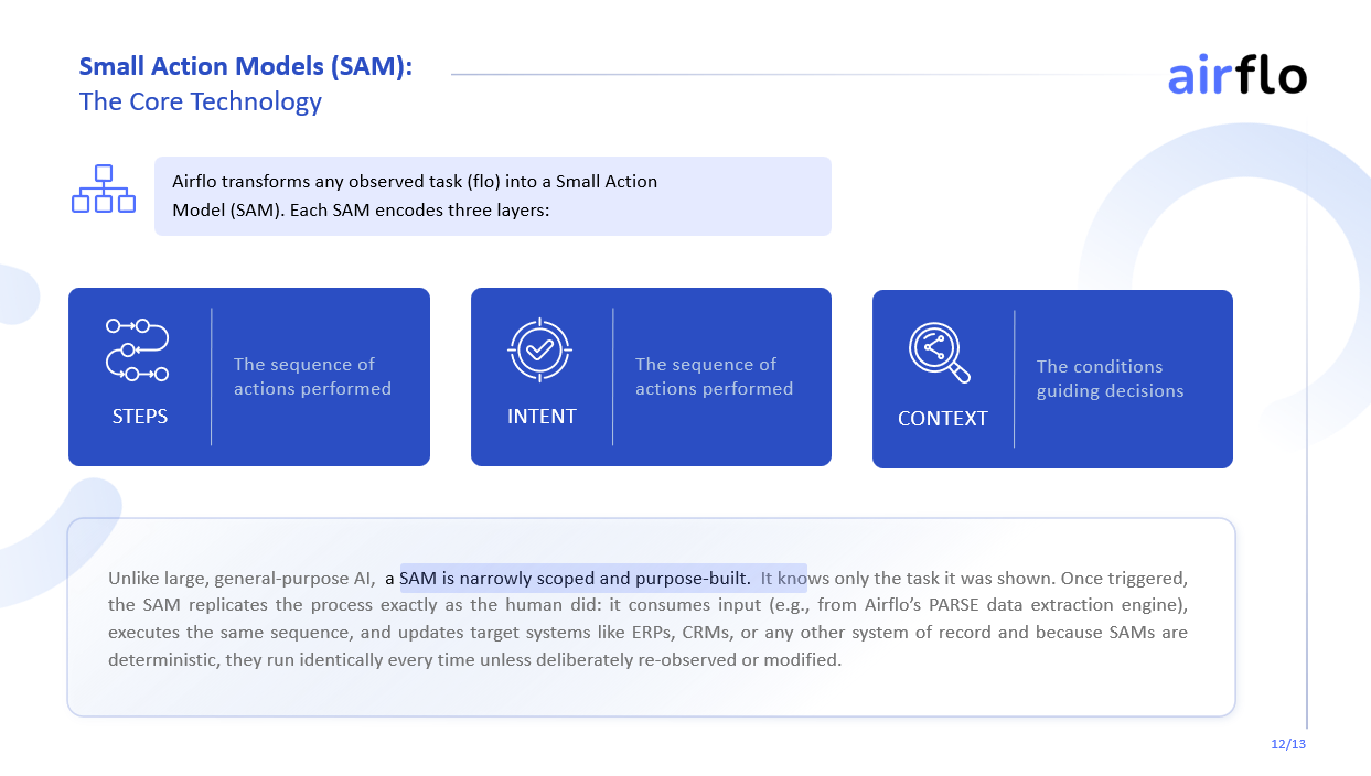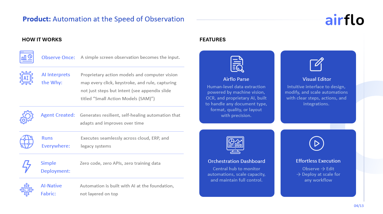 Forget the old-school RPA that breaks when someone sneezes near a workflow, or “AI agents” that live and die inside a browser tab. Airflo creates adaptive, self-healing automations powered by proprietary Small Action Models (SAMs) that understand intent, context, and steps. This allows organizations to transform any workflow into resilient, learning automation in minutes—running on-prem or in the cloud, fully enterprise-ready. We’re not automating tasks, we’re teaching machines how to work.