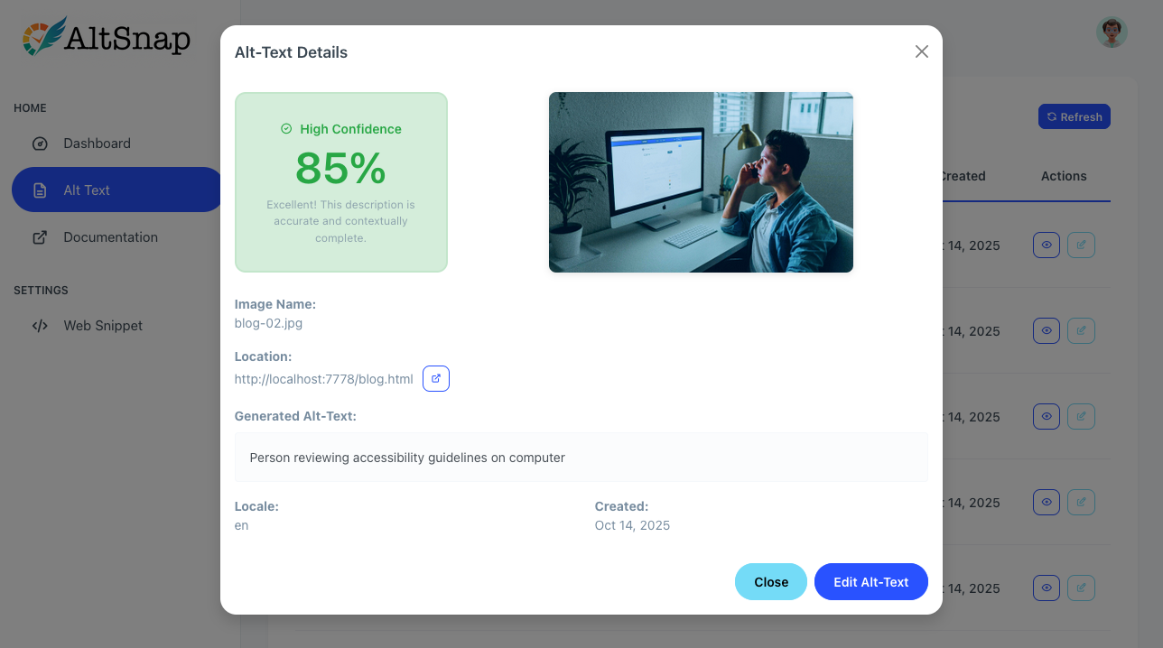 That’s why I built AltSnap.ai — to automatically generate context-aware alt text with a confidence score, so you can instantly see which images meet standards and which ones might need review.