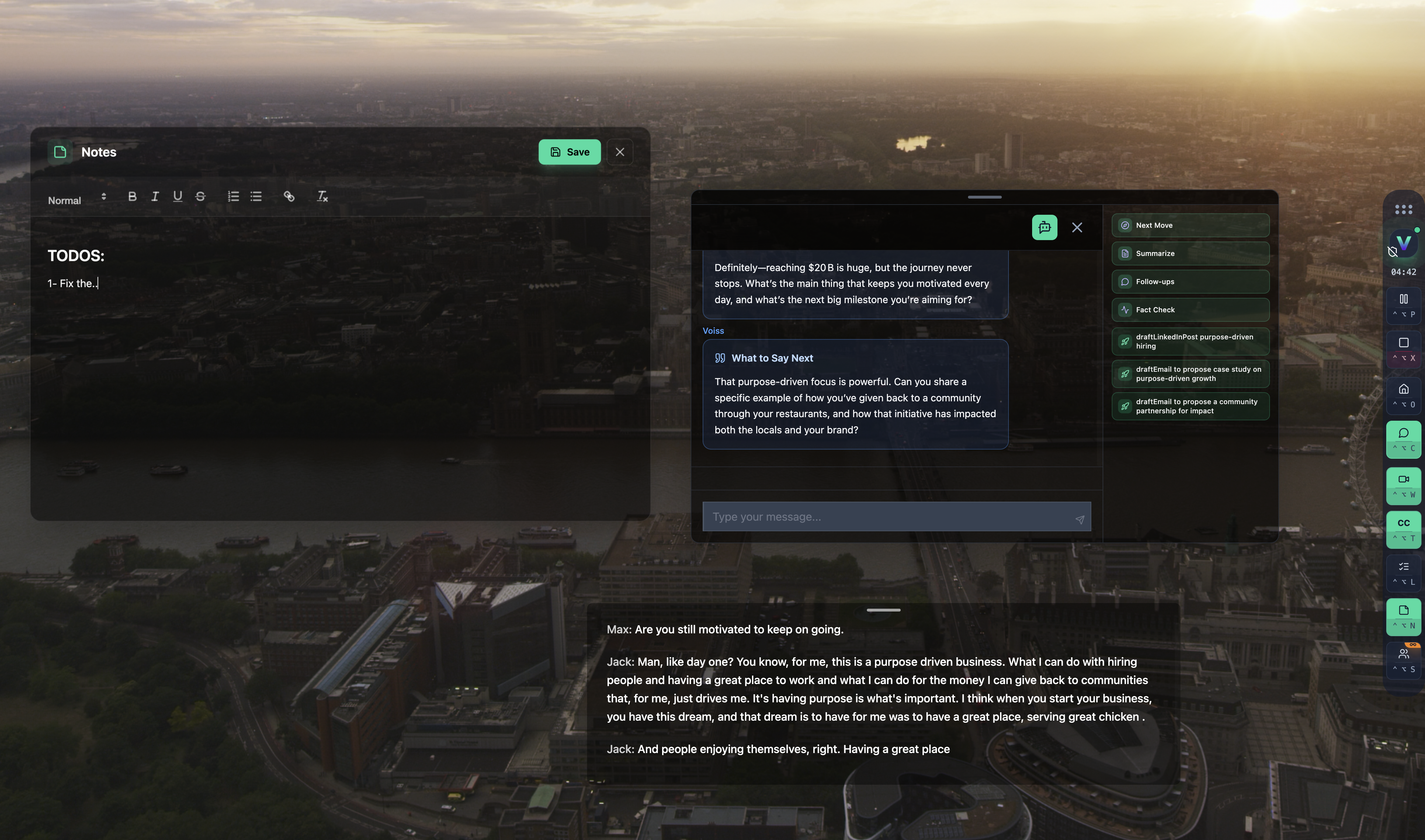 The idea of voissai is to empower people who makes calls with AI, by providing live caption and ai suggestioons to achieve their goals during their calls and also post call intelligence. Like ai chat about the call and recording of audio or screen recording with chapters and summaries and artifacts like follow up emails and notes .