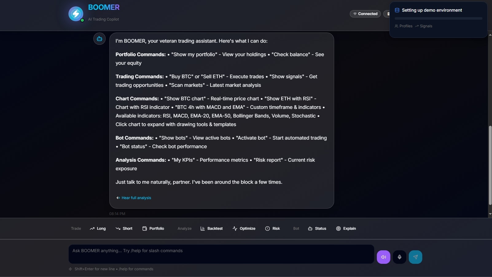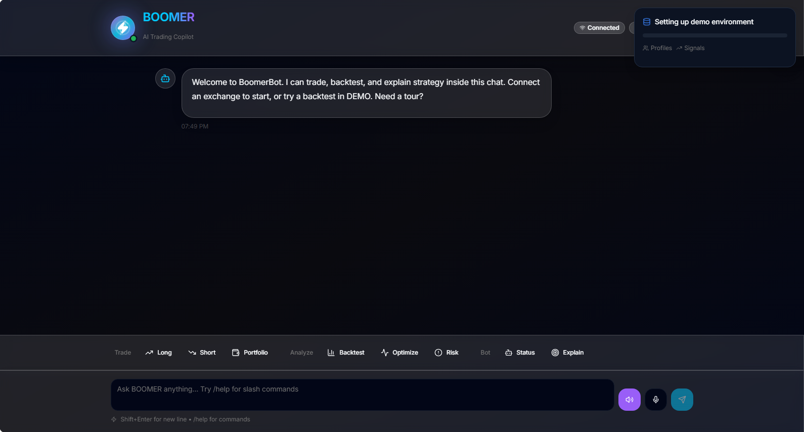 I built Boomer to free traders from endless chart-watching. With real-time signals and smart execution, Boomer helps by talking an giving clear reasoning behind trades.