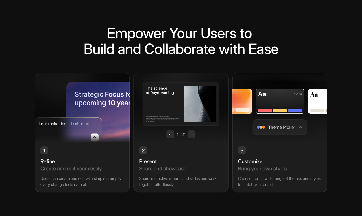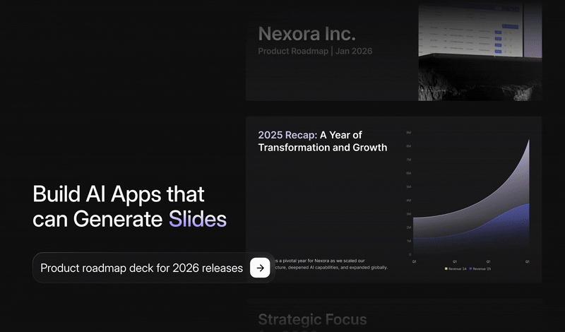 Today, your users are stuck app-hopping: They pull insights from your product, switch to ChatGPT to summarize, then move everything into Google Slides or PowerPoint and spend hours creating slides & reports to share with their team. It’s slow, manual, and breaks the workflow.