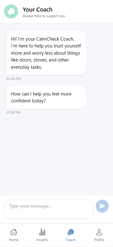CalmCheck is an AI-powered self-trust app for people whose anxiety, intrusive doubt or OCD-like thoughts make them repeatedly check doors, stoves, meds, locks and more. It combines visual proof with personalized cognitive guidance to turn constant "Are you sure?" into calm, clarity and measurable progress.