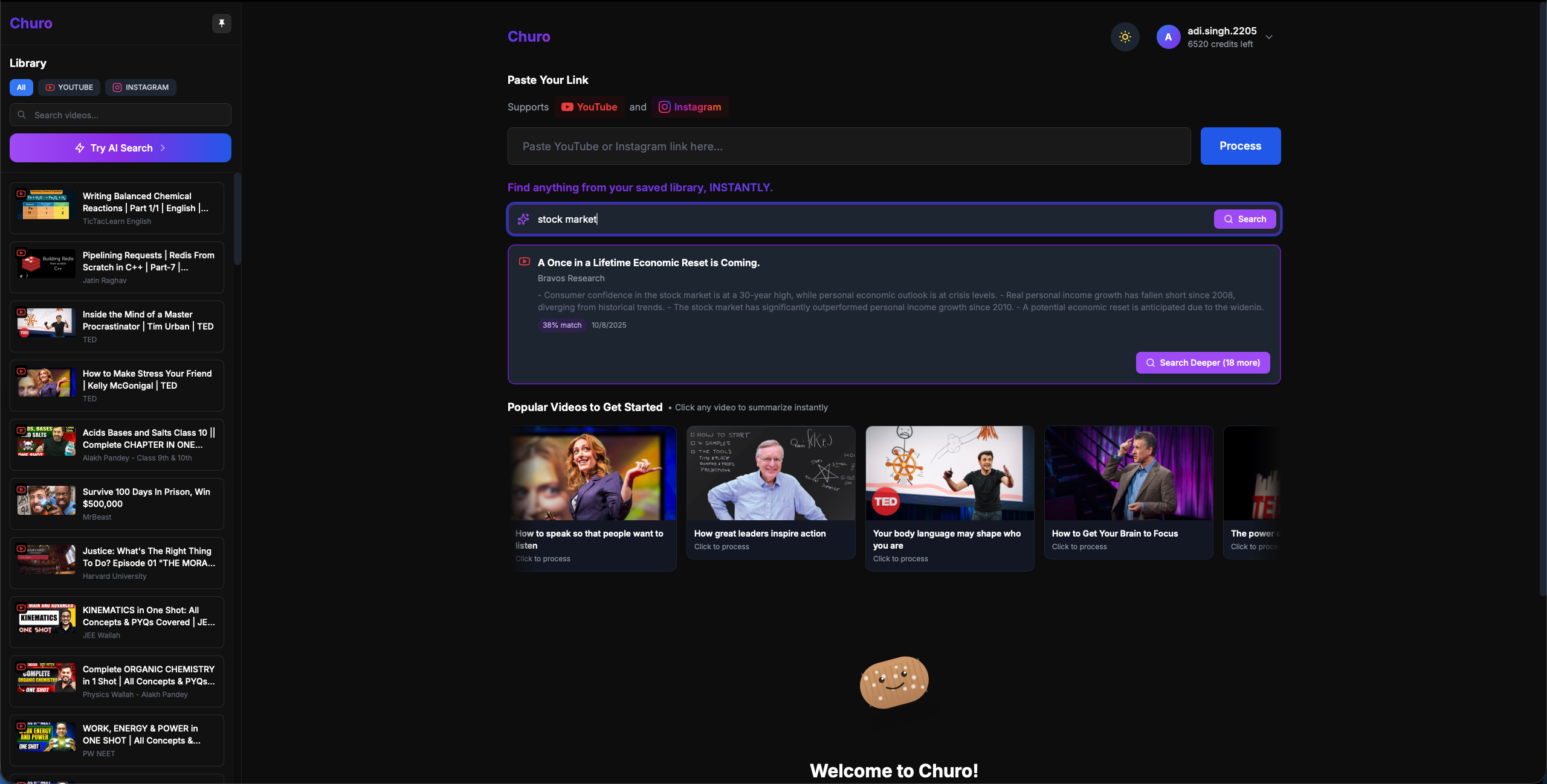 I'd save dozens of YouTube videos and Instagram reels every week, thinking "I'll watch this later" or "this has something useful." Fast forward a few months, and I had hundreds of saved videos that might as well not exist. I'd remember a video had this one tip I needed, but finding it? Impossible. So I built Churo to fix this for myself. What makes it different is the semantic search that actually understands meaning, not just keywords. You can search "productivity tips" and it'll surface that video about morning routines you saved six months ago, even if it never used those exact words. We combine YouTube and Instagram in one library, generate comprehensive AI summaries with chapters and flashcards, and let you chat with your entire collection like it's a conversation. I'm most proud of getting the search to feel magical, that moment when it finds exactly what you were thinking of but couldn't quite describe. Also proud I built this whole thing solo while juggling college, learning everything from vector databases to Chrome extensions along the way. It started as scratching my own itch, but seeing other people finally able to find and use what they save? That's incredibly rewarding.