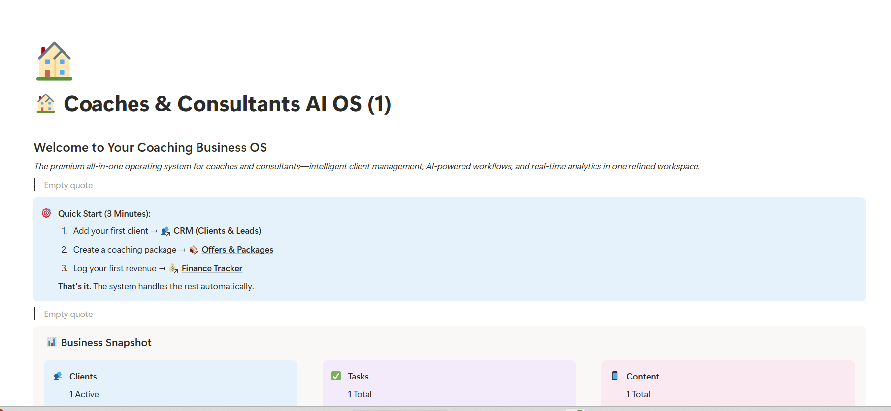 "The Only Coaching OS That Shows You, Not Just Tells You" This isn't a template. It's business intelligence. Most templates help you “get organized.” This OS helps you grow your business. This isn’t a page of tables — it’s a full operating system that integrates AI, automation, and analytics directly into Notion. See for yourself : https://aiosystems.notion.site/Coaches-Consultants-AI-OS-1-29cf3b930f7b81b687c9fbe9581a4f54