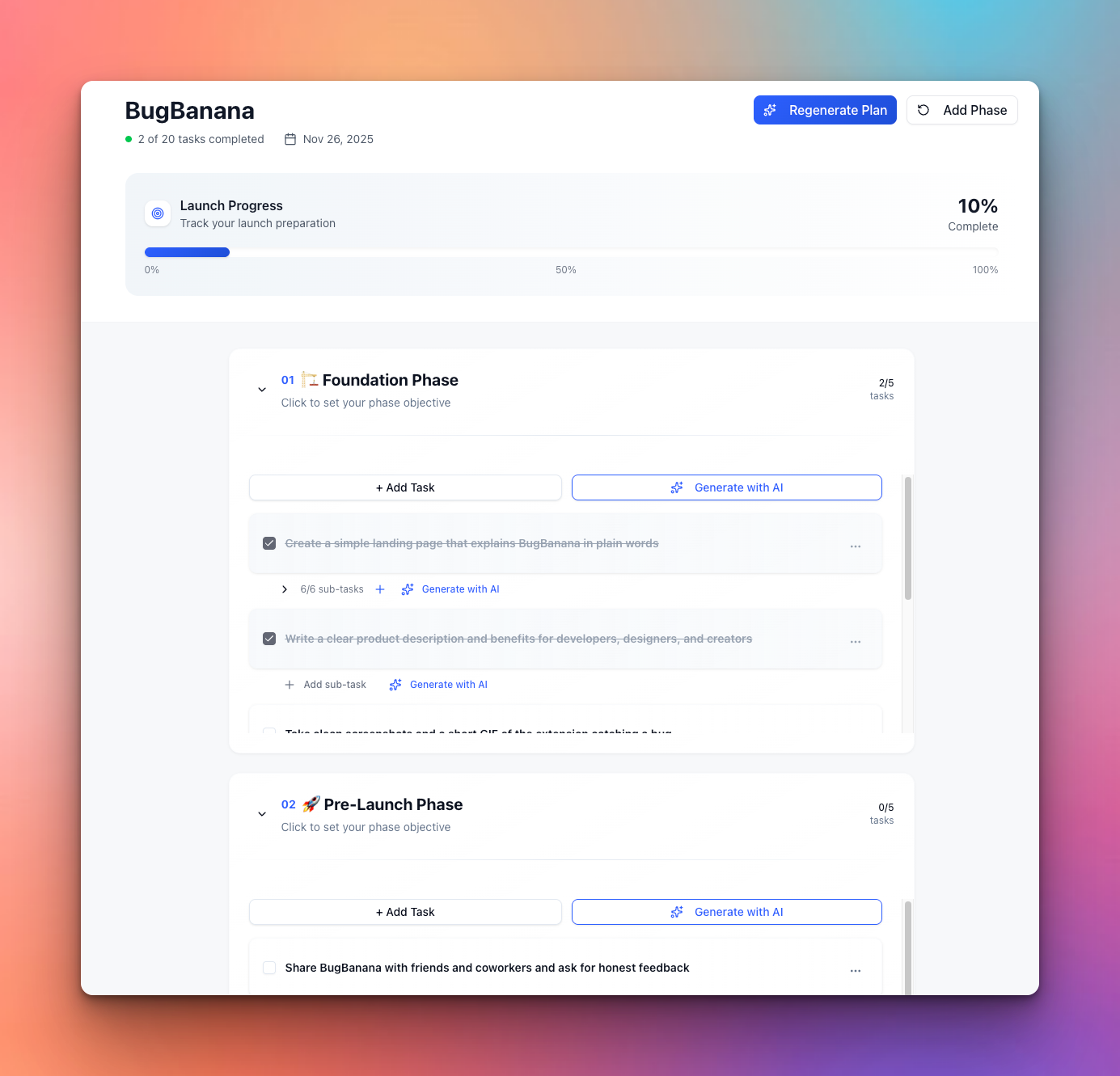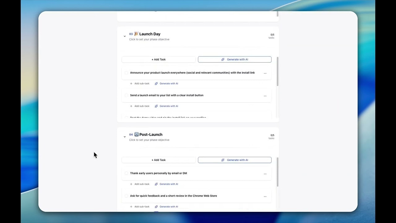 With CoLaunchly 2.0, you get a fully personalised AI-generated roadmap for your product launch, with clear tasks, content ideas, and channel strategy so you can launch faster with zero guesswork.