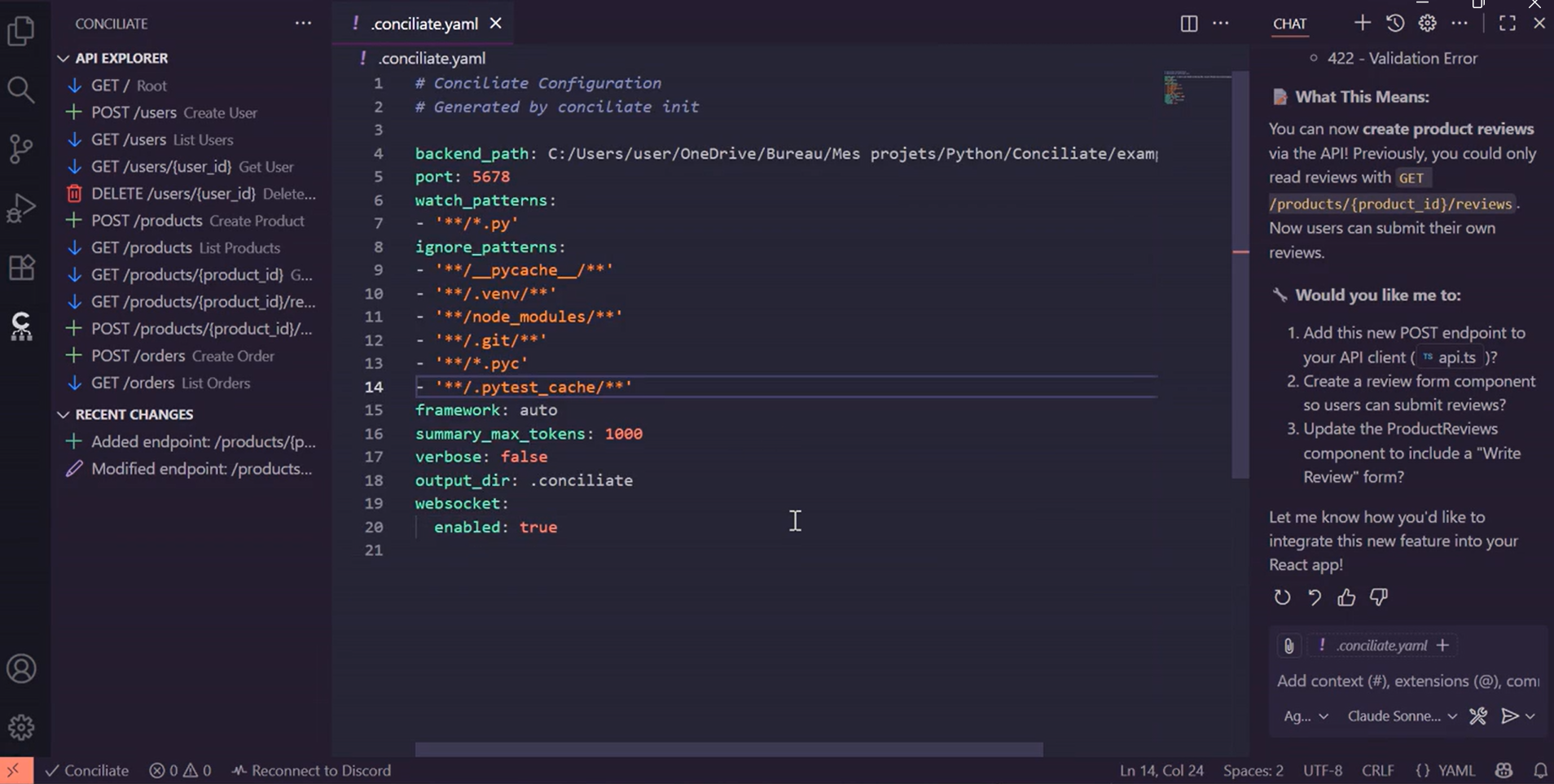 Most tools solve spec synchronization (OpenAPI <-> frontend/backend), but none natively integrate with AI coding assistants or automatically update contextual knowledge (like your `API.md` file feeding AI prompts). That's the purpose of Conciliate — a local schema bridge between multiple IDE AI sessions.