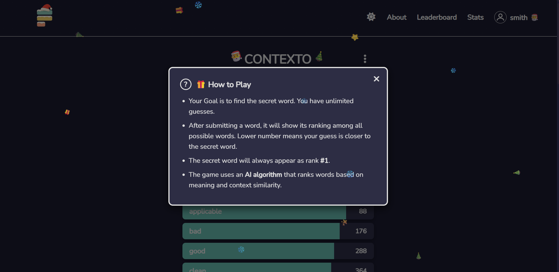 Contexto is my take on a smarter word-guessing game β instead of letters, you get semantic similarity rankings powered by word embeddings. Your goal is to find the secret word by exploring meaning, not spelling.