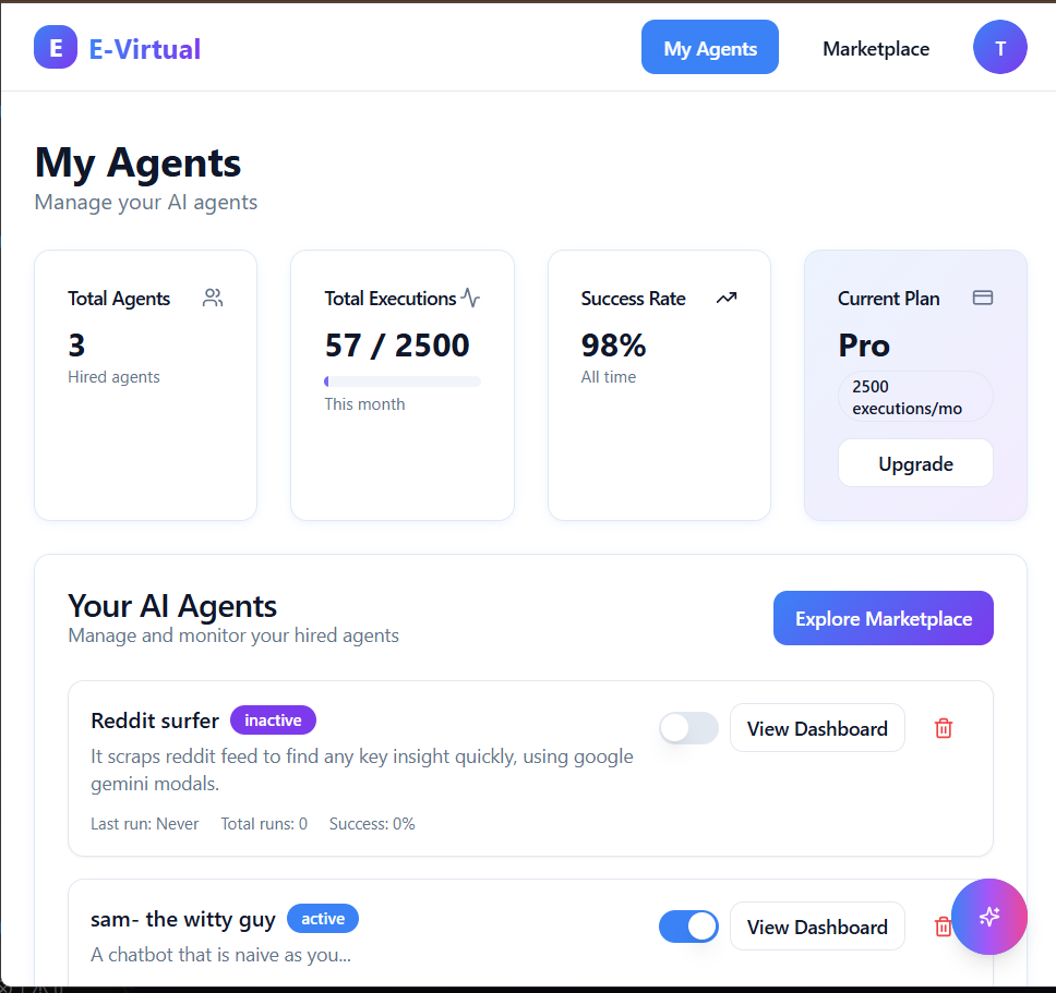 Hi! we had build (reality= building) E-Virtual, the AI agents platform, where you can discover pre built ai agents ready to work for you 24/7.