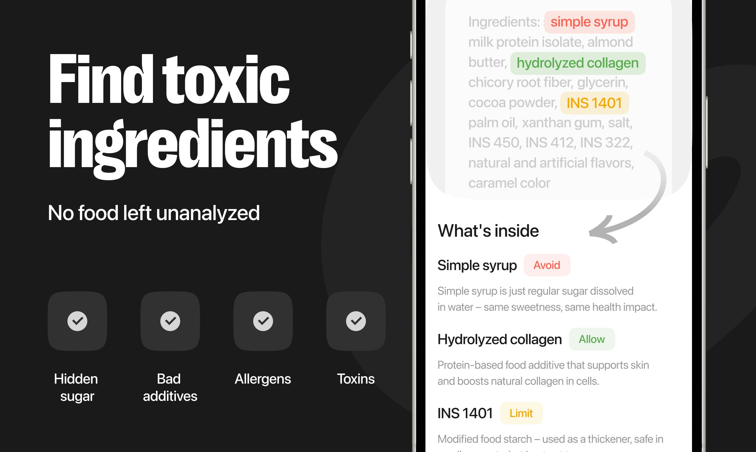 • Detects 12+ ingredient categories – sweeteners, hidden sugars, E-numbers, INS codes, allergens, and more