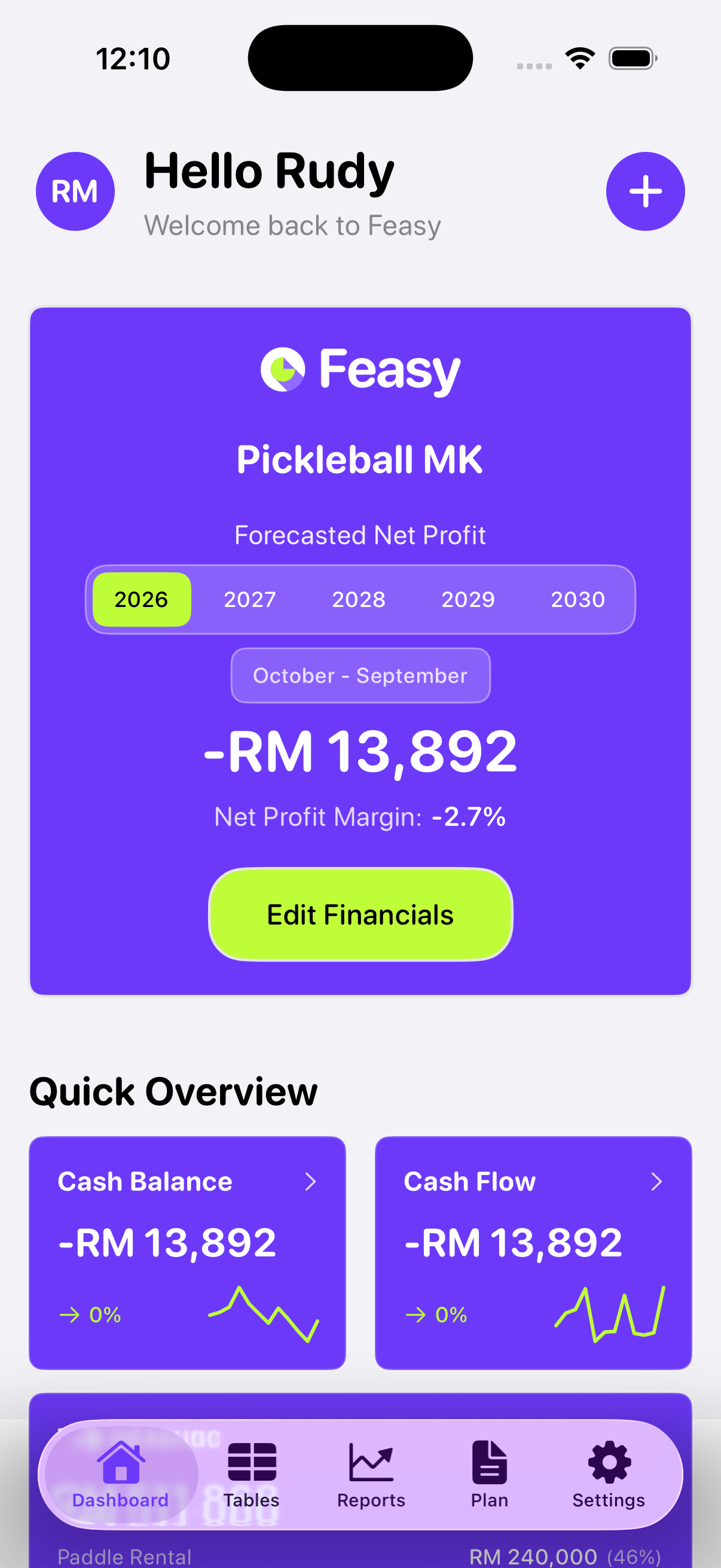 So I built Feasy to solve my own problem. It’s a mobile-first financial forecasting app that lets anyone see if their idea makes financial sense — fast. You just key in what you already know: revenue, expenses, assets, and a few assumptions. Feasy’s built-in financial builders guide you step by step, and instantly generate your Profit & Loss, Cash Flow, and Balance Sheet reports automatically.