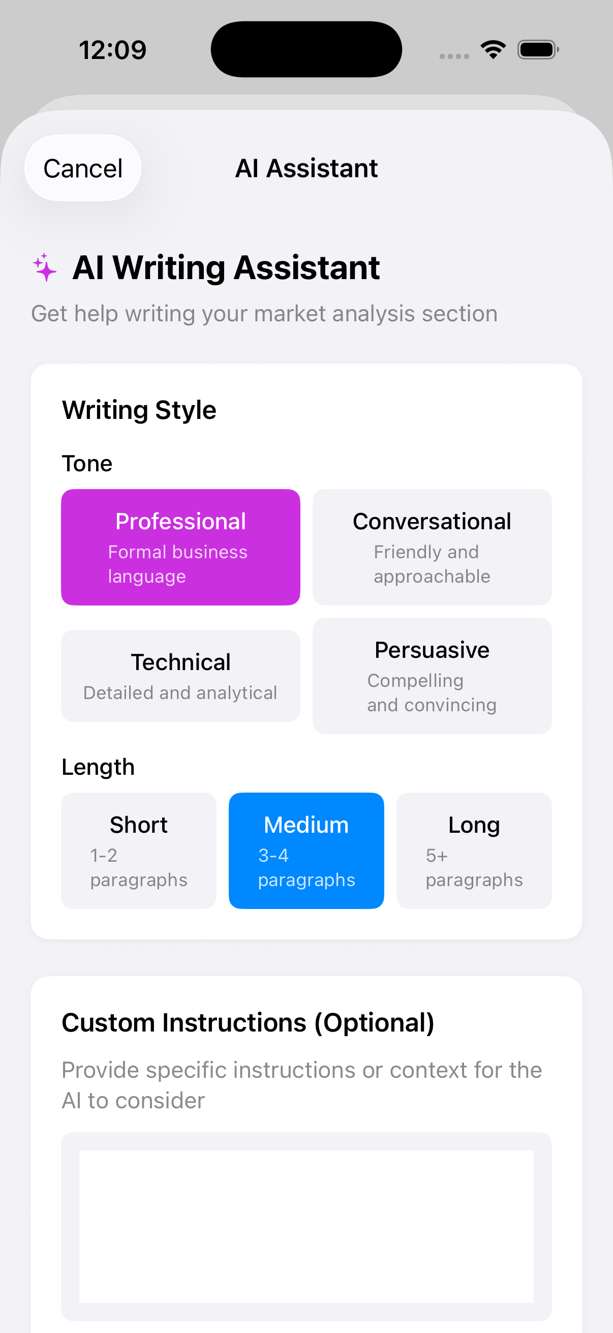 Then comes the AI magic — Feasy helps you turn those numbers into a professionally written, investor-ready business plan in minutes.