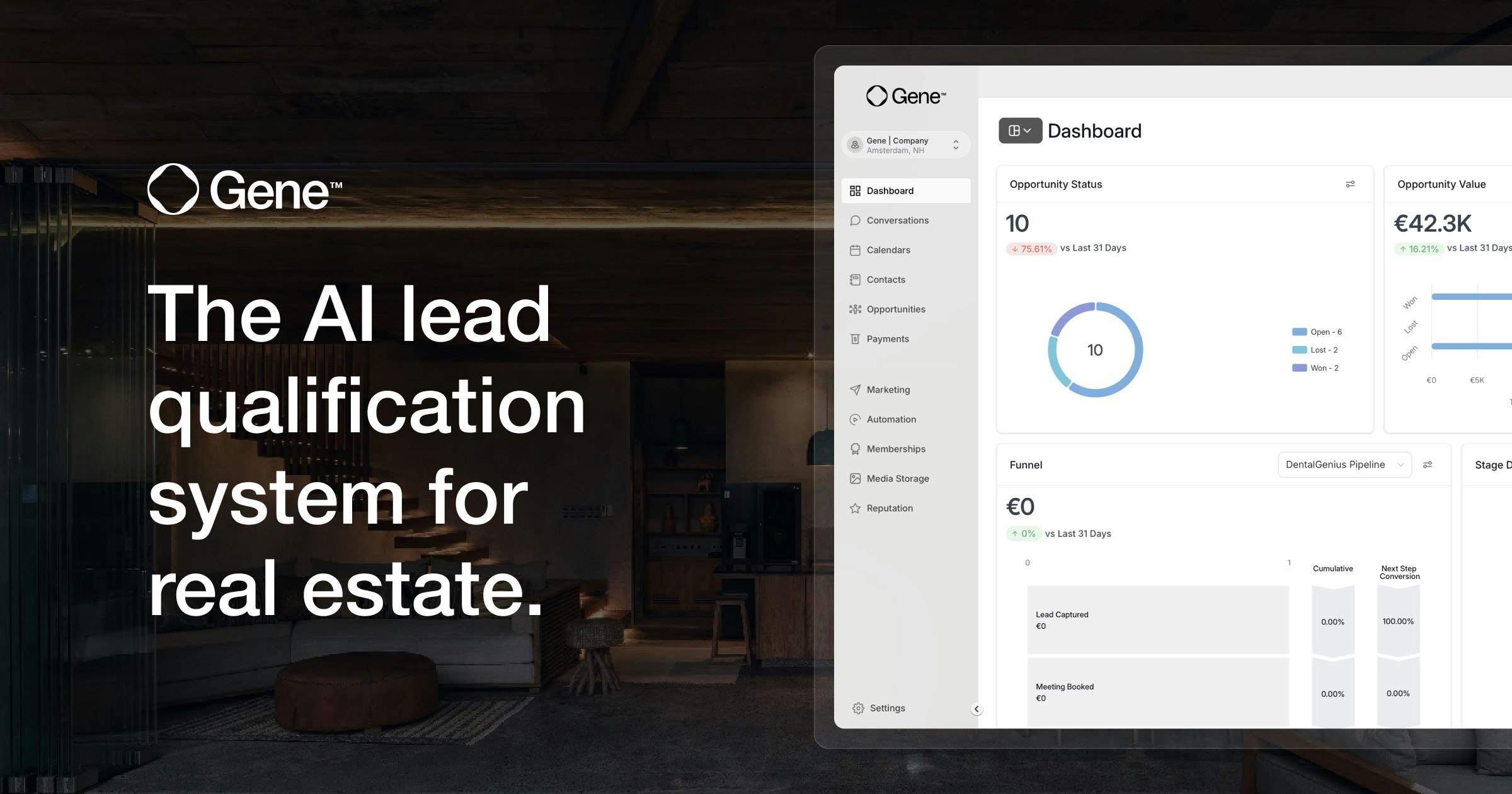 Meet Gene. The intuitive AI platform for real estate developers and agencies. Engage every lead within seconds, in any language, around the clock. Automate scheduling, streamline your pipeline, and never miss another opportunity.