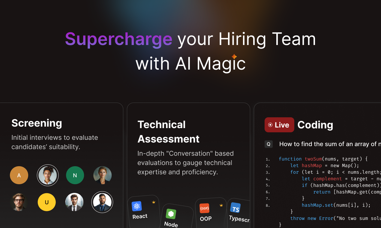 InterWiz is specialized for companies focused on technical hiring. Itβs perfect for tech companies, recruiting companies, and teams needing to efficiently assess both technical and soft skills. InterWiz empowers hiring teams with AI-driven efficiency, allowing engineering teams to focus on core business objectives, while enabling technical leadership to achieve growth targets seamlessly.