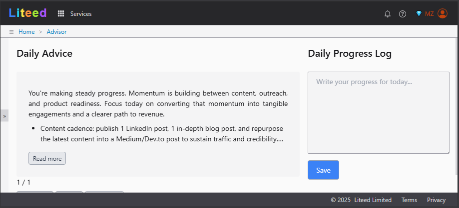 So I built a system that has full context based on daily progress logs, organization data, and an evolving project story. This makes the advice practical, personal, and actionable. I also saw many founders facing the same problem: getting lost in daily tasks, losing sight of strategy, and having no one to challenge their thinking.