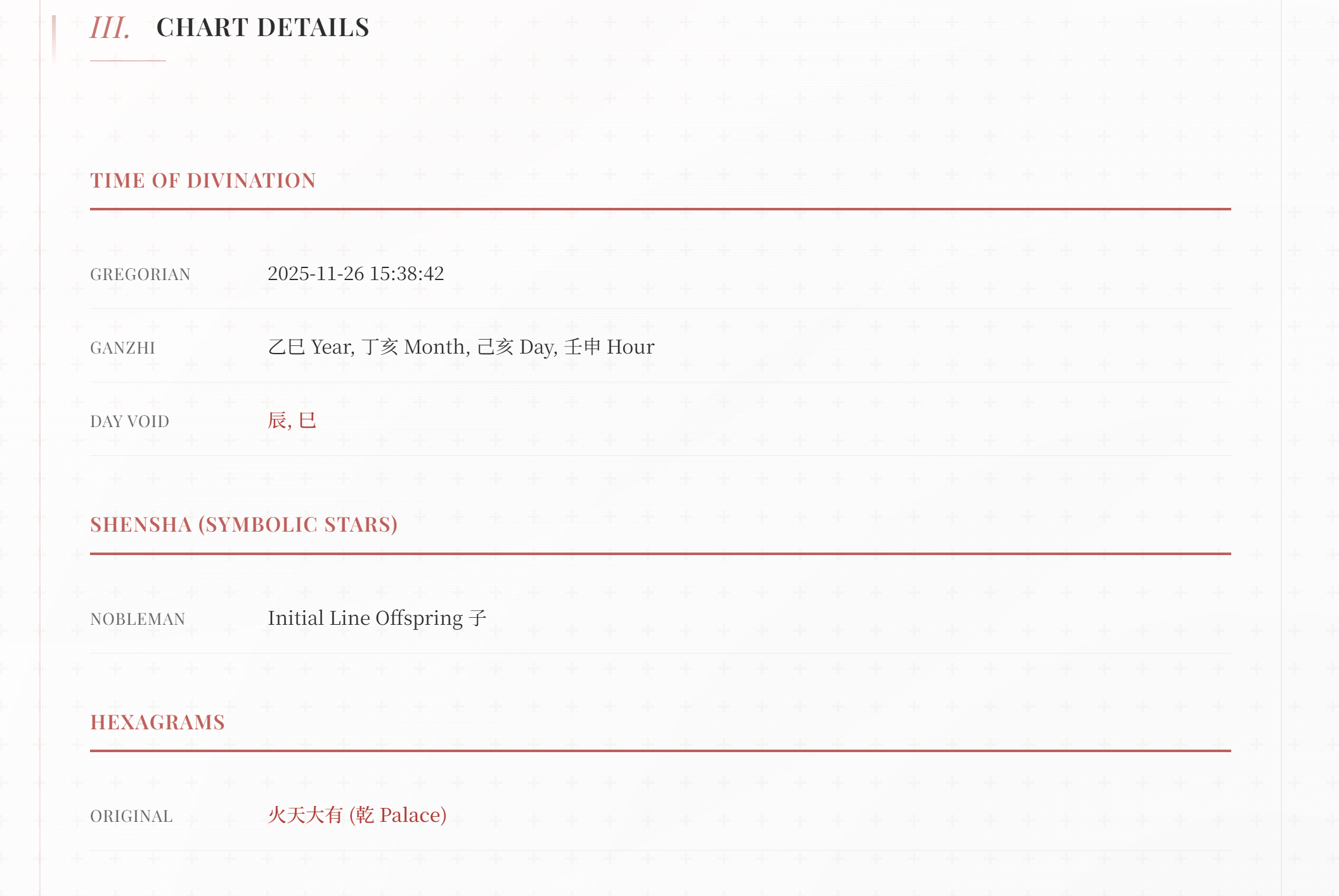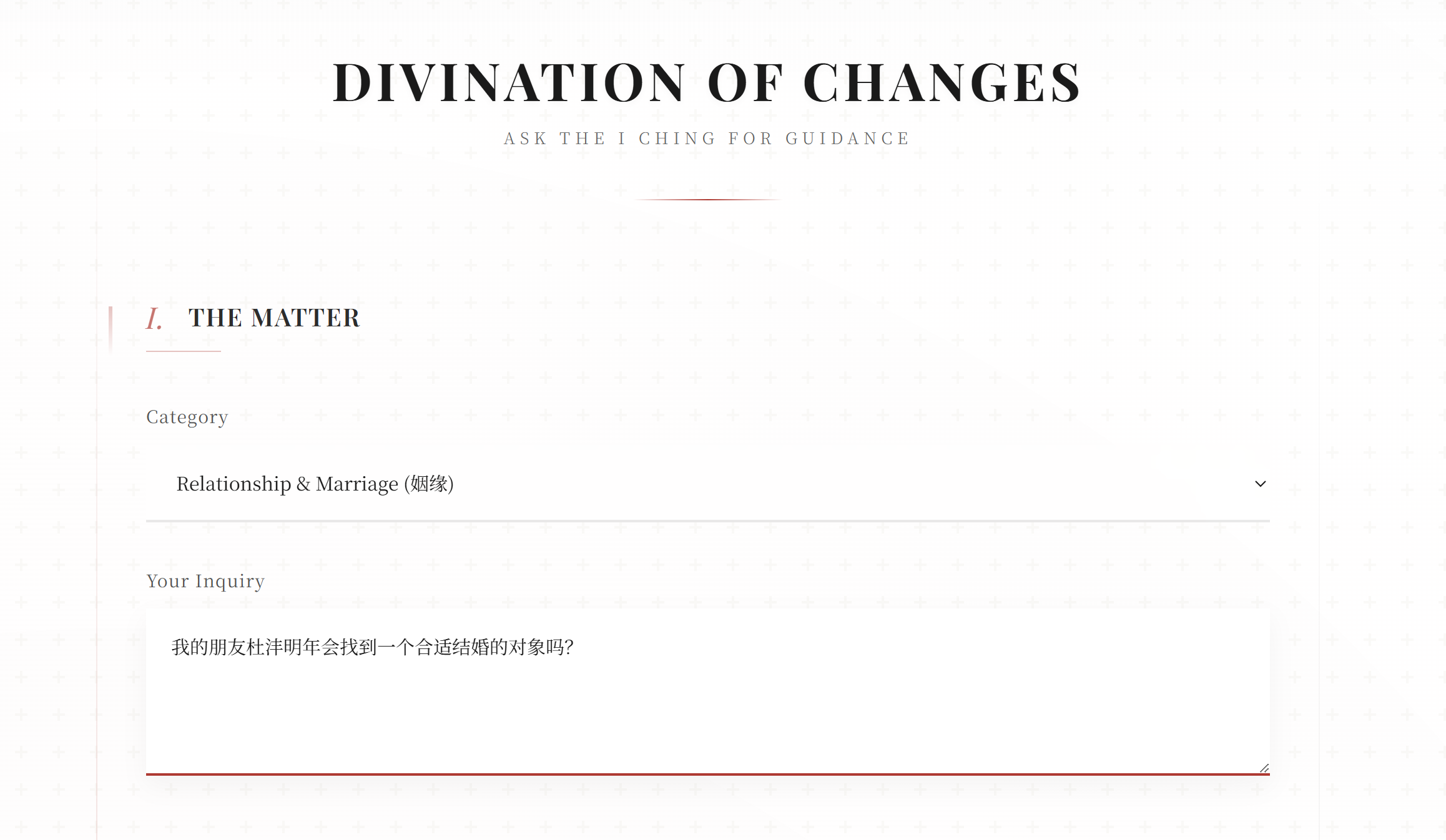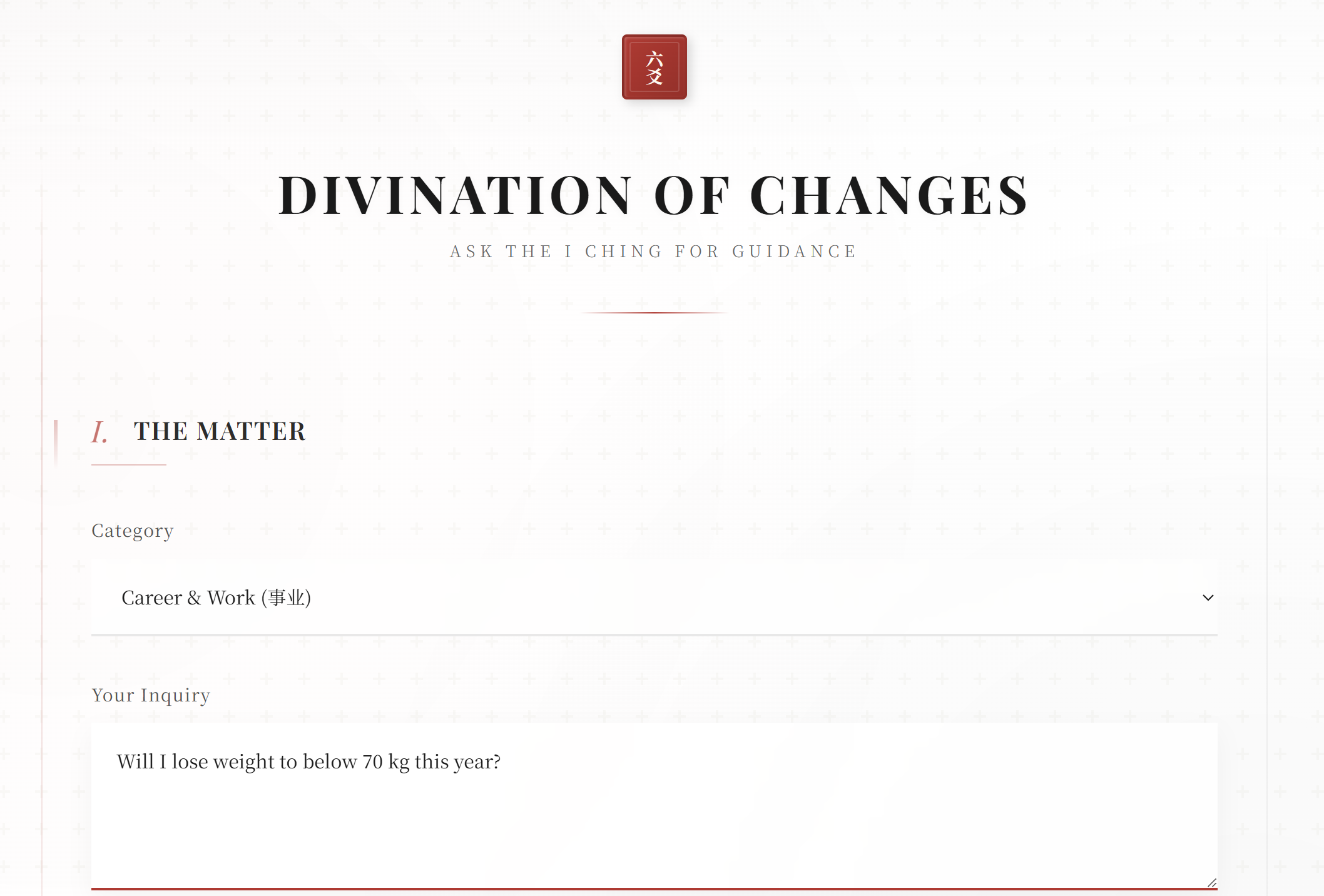Thank you for checking out my work. This project began with a simple belief: ancient wisdom should not be diluted in the digital age. Liu Yao is one of the most precise forms of I Ching divination, yet online tools have turned it into coin flips and random results.