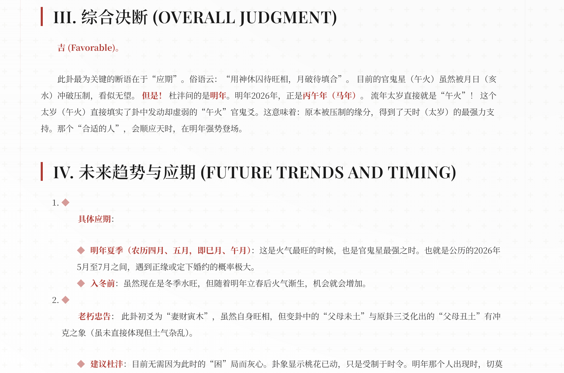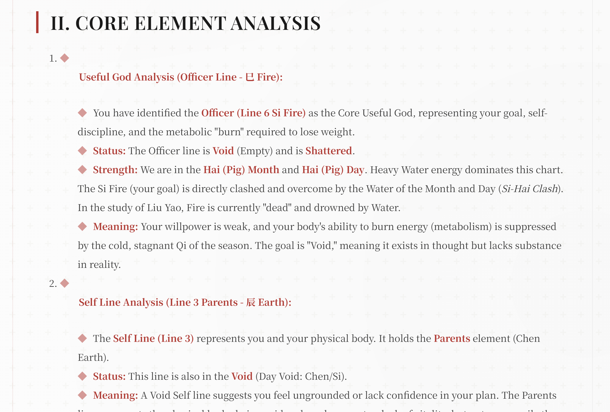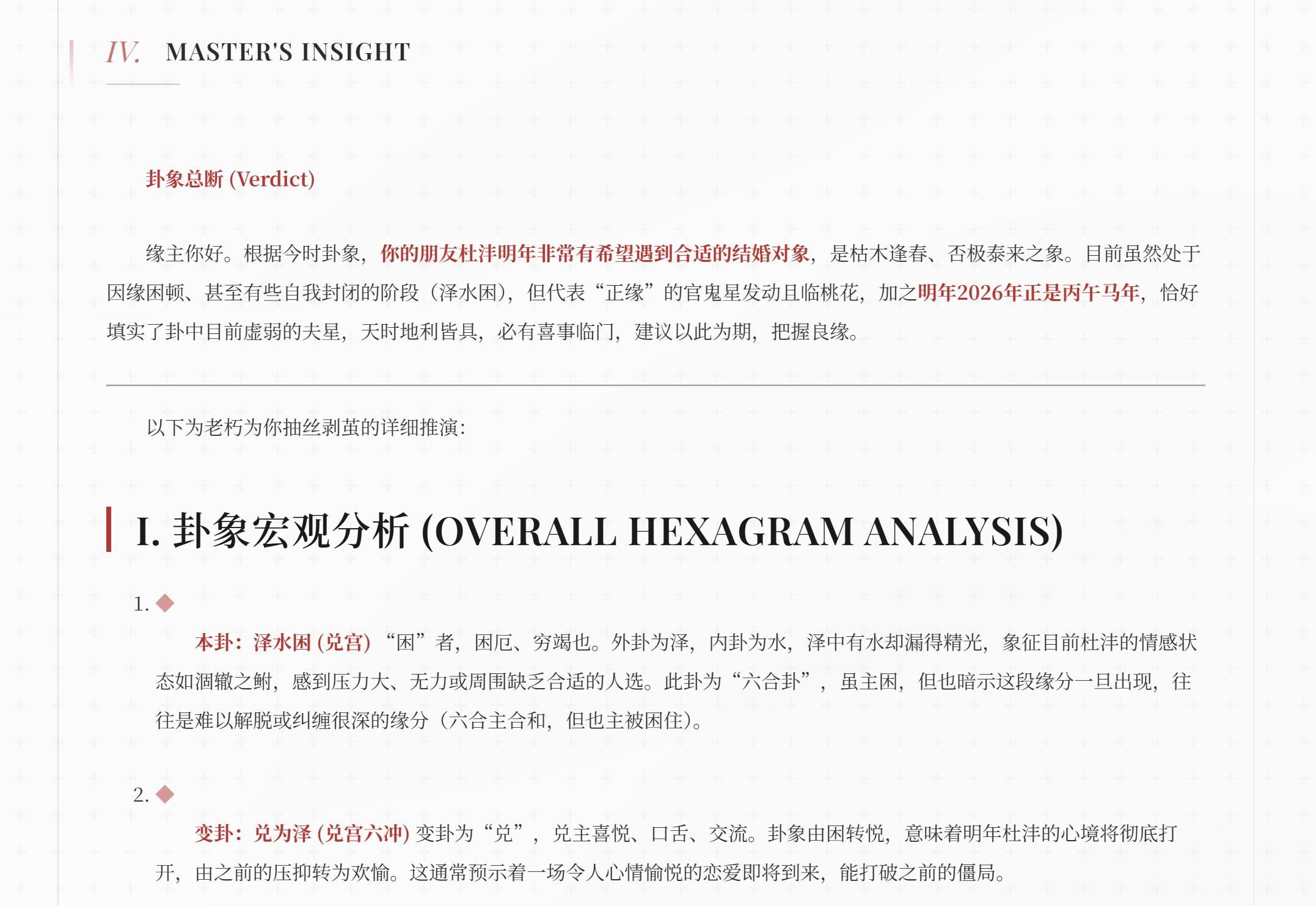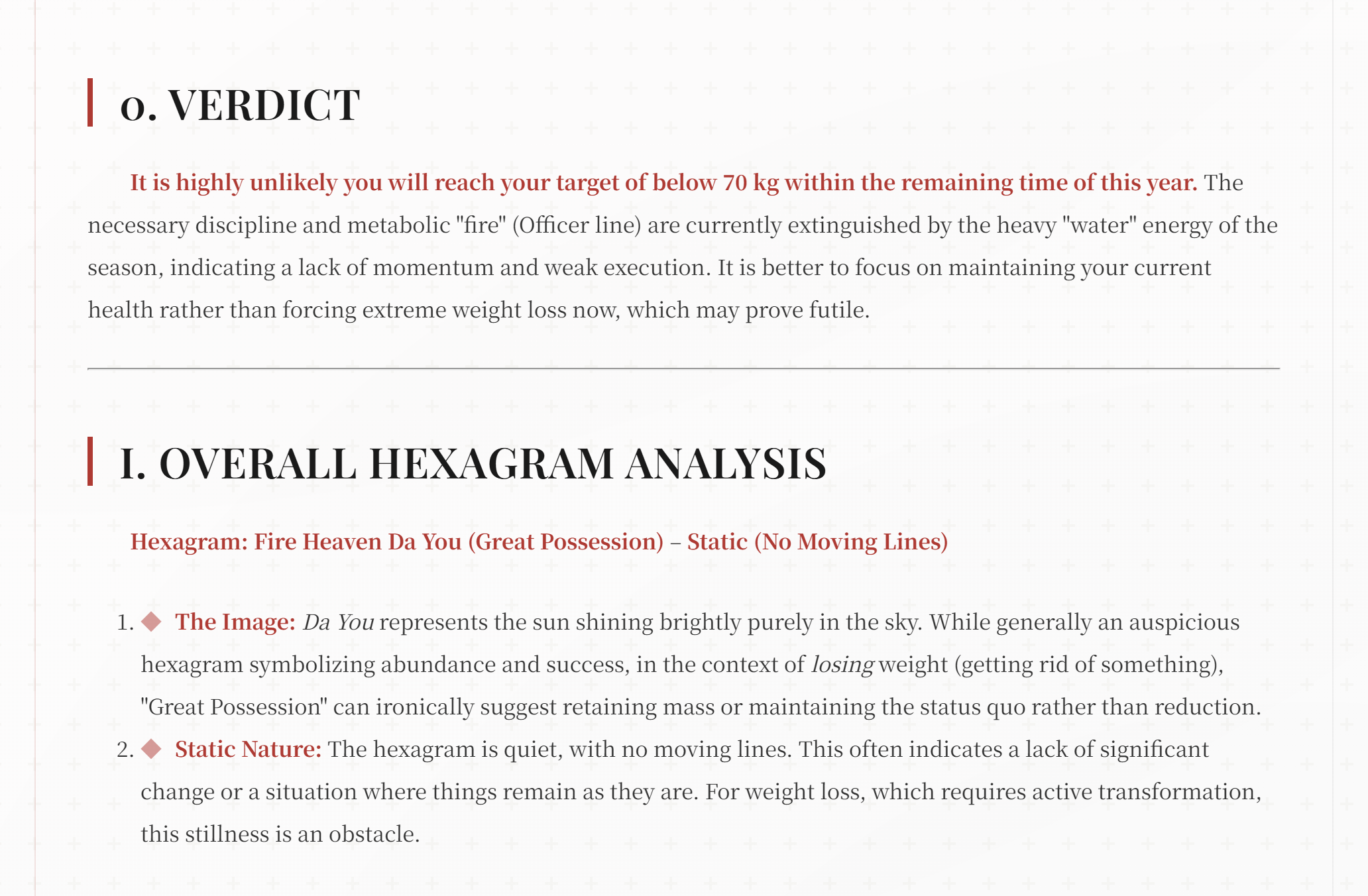 Using lunar.js for accurate time cycles, the classical Na Jia framework for line interpretation, and Gemini 3 Pro guided by thousands of refined prompts, I built an AI Liu Yao that behaves like a true practitioner — not a random generator.
