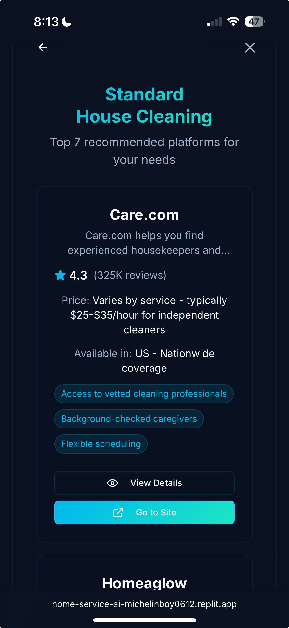 Mate is an AI assistant that helps you quickly choose the right platform for home services like cleaning, repairs, childcare, and pet care. You type what you need, the AI asks a few quick questions, compares options like TaskRabbit and Handy, then recommends the best match. It also creates a summary you can paste into the booking form. Built with Next.js, Supabase, Prisma, and GPT-4o. Early version—feedback is welcome!