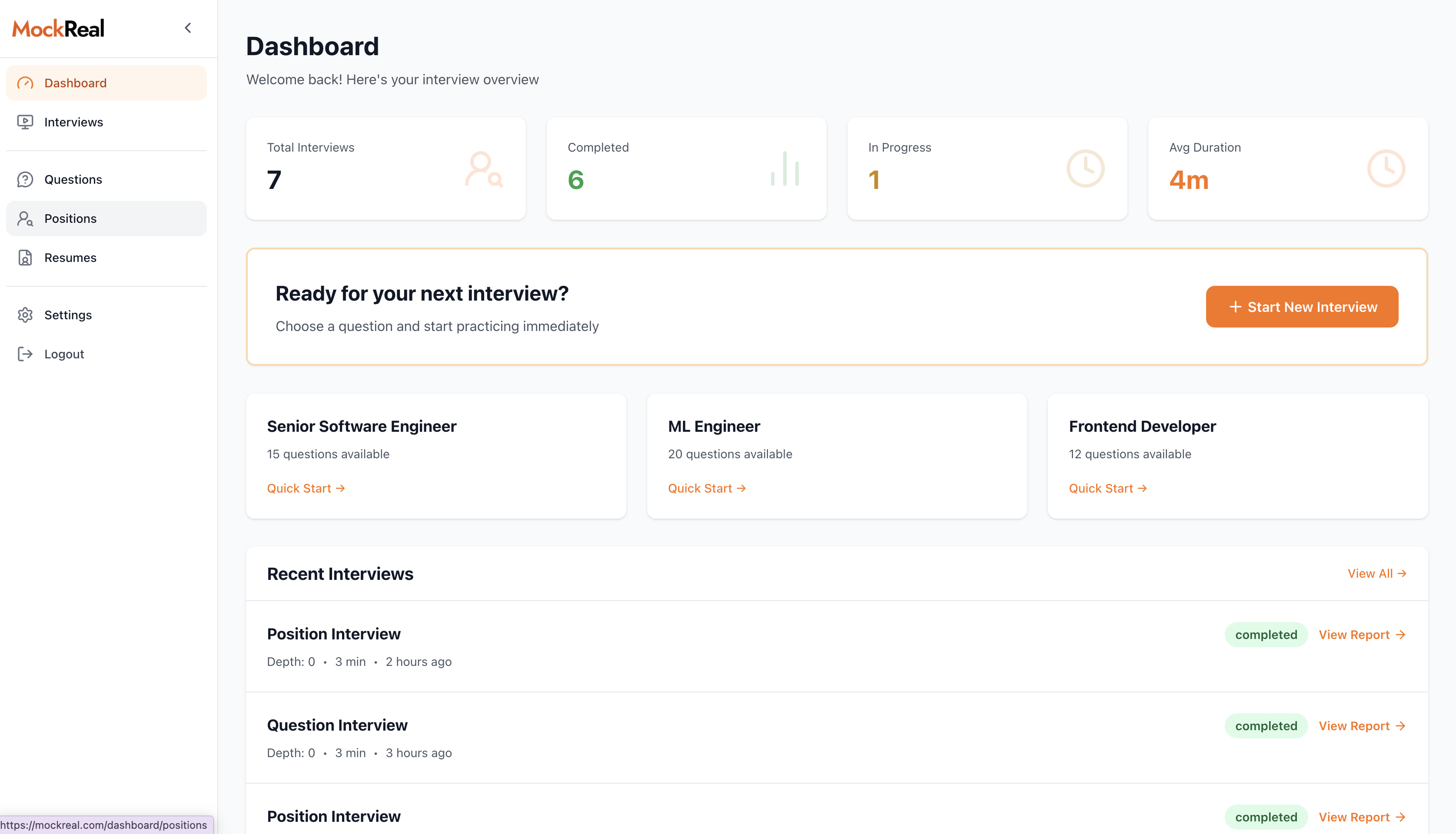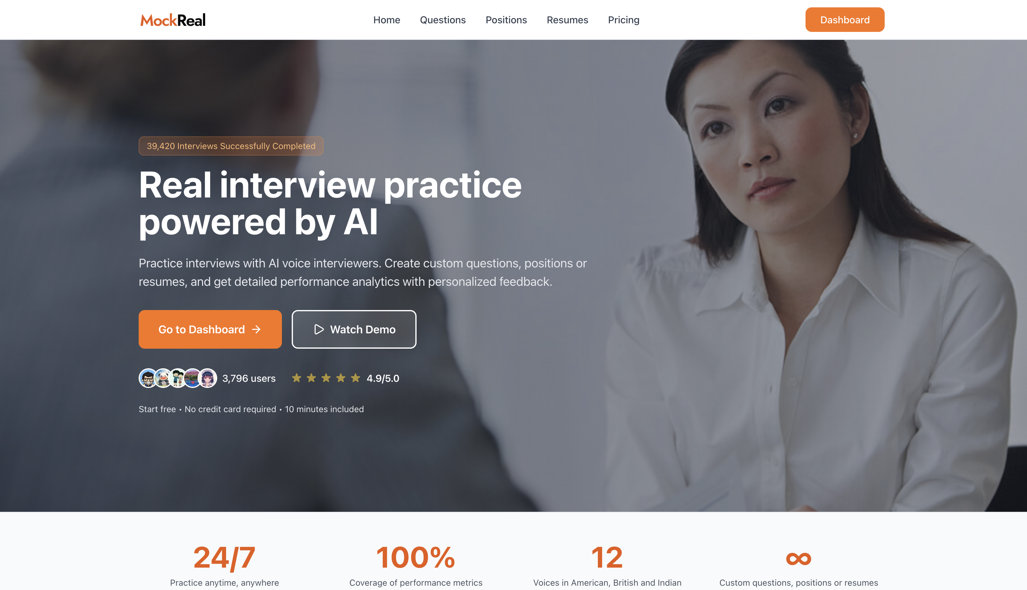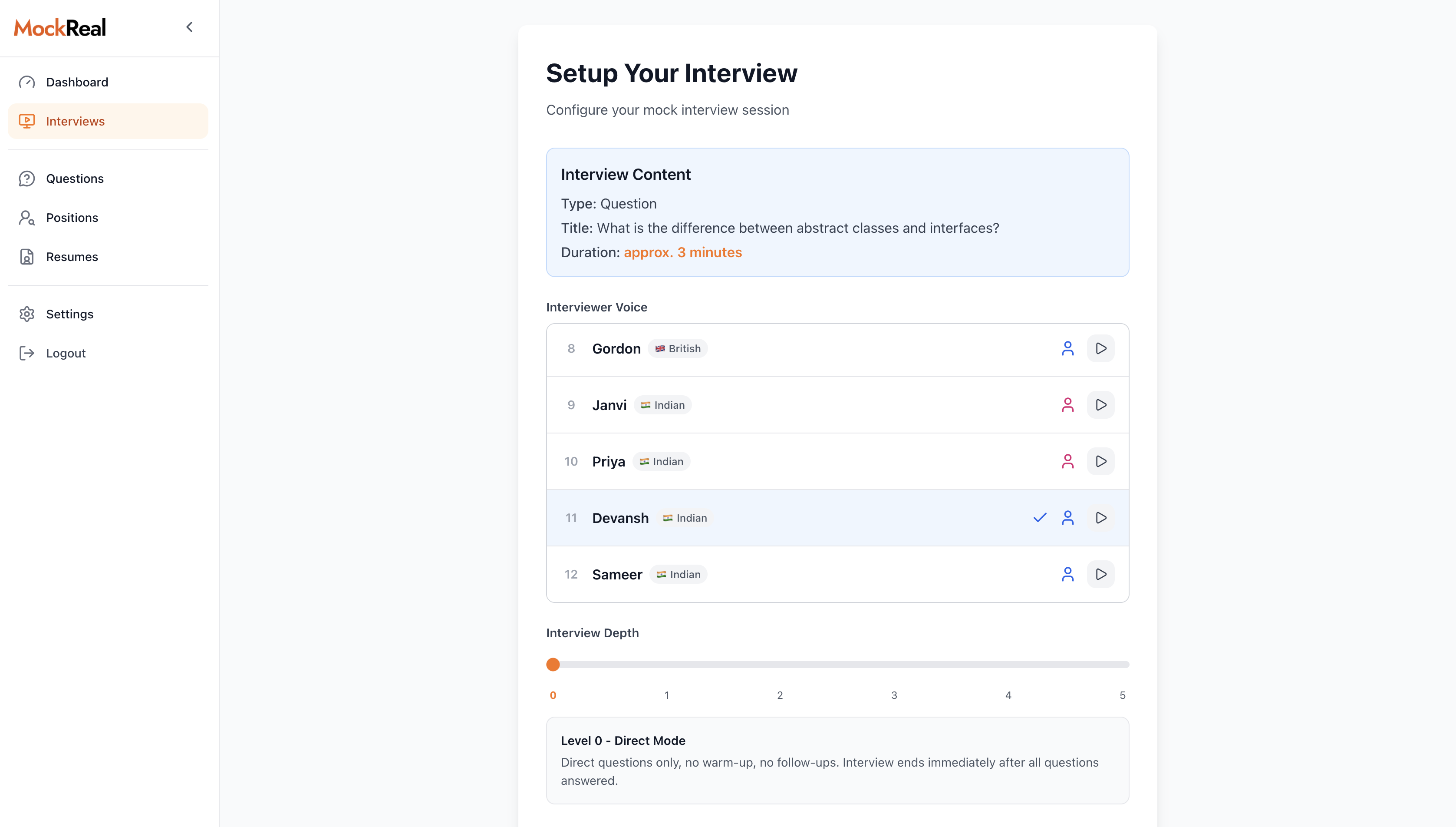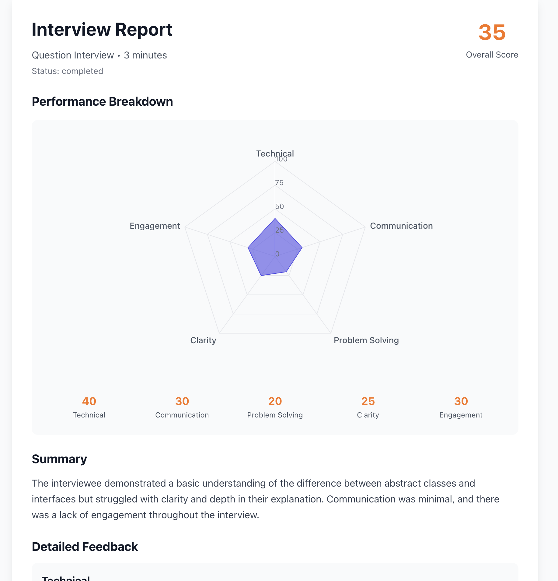 Ace your technical interviews with AI voice interviewers. Create custom questions, upload resumes, and get comprehensive performance analytics. Choose from 6 AI voices, practice with adaptive difficulty levels, and review detailed feedback with recordings and transcripts.