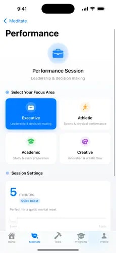 Nivana creates a fresh, AI-personalized meditation each session. Pick a goal (focus, sleep, sport, creativity), set duration, and go. Includes 1-min resets, Focus Sprints, affirmations, and journaling.