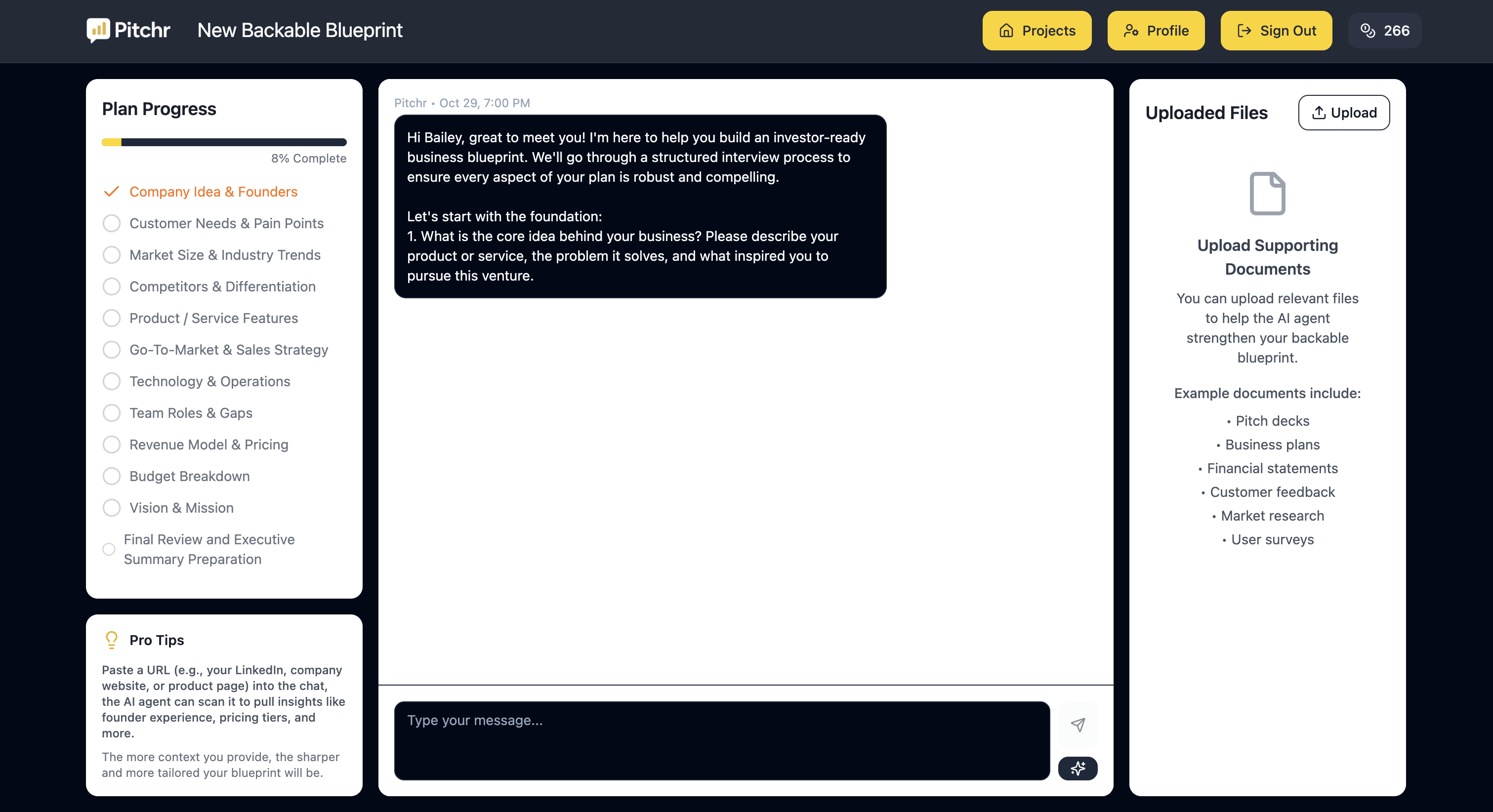 Our goal was to create an AI co-founder that helps entrepreneurs think critically, explore opportunities, and make smarter decisions. Pitchr is the tool we wished existed when we were starting out, and now it’s here to help others bring their ideas to life.