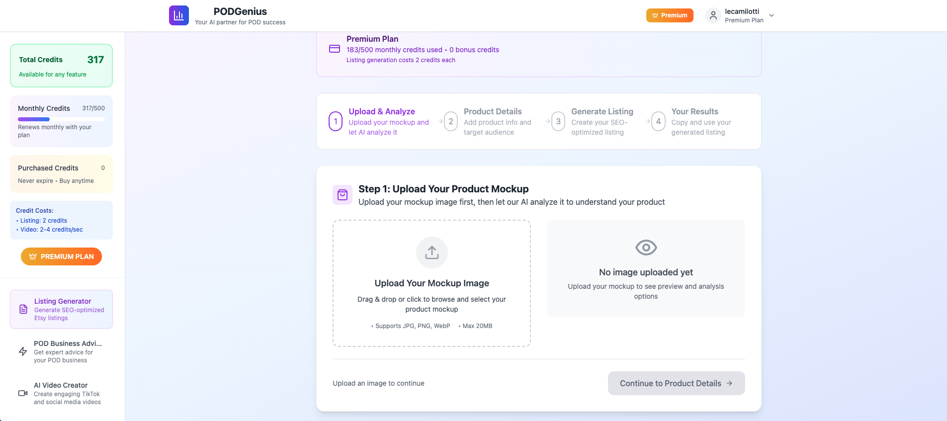 PODGenius uses AI to turn your Print-On-Demand products into fast selling assets generate marketing videos from product images and instantly create SEO-optimized listings (titles, descriptions & tags) for platforms like Shopify, Redbubble, Amazon and Etsy