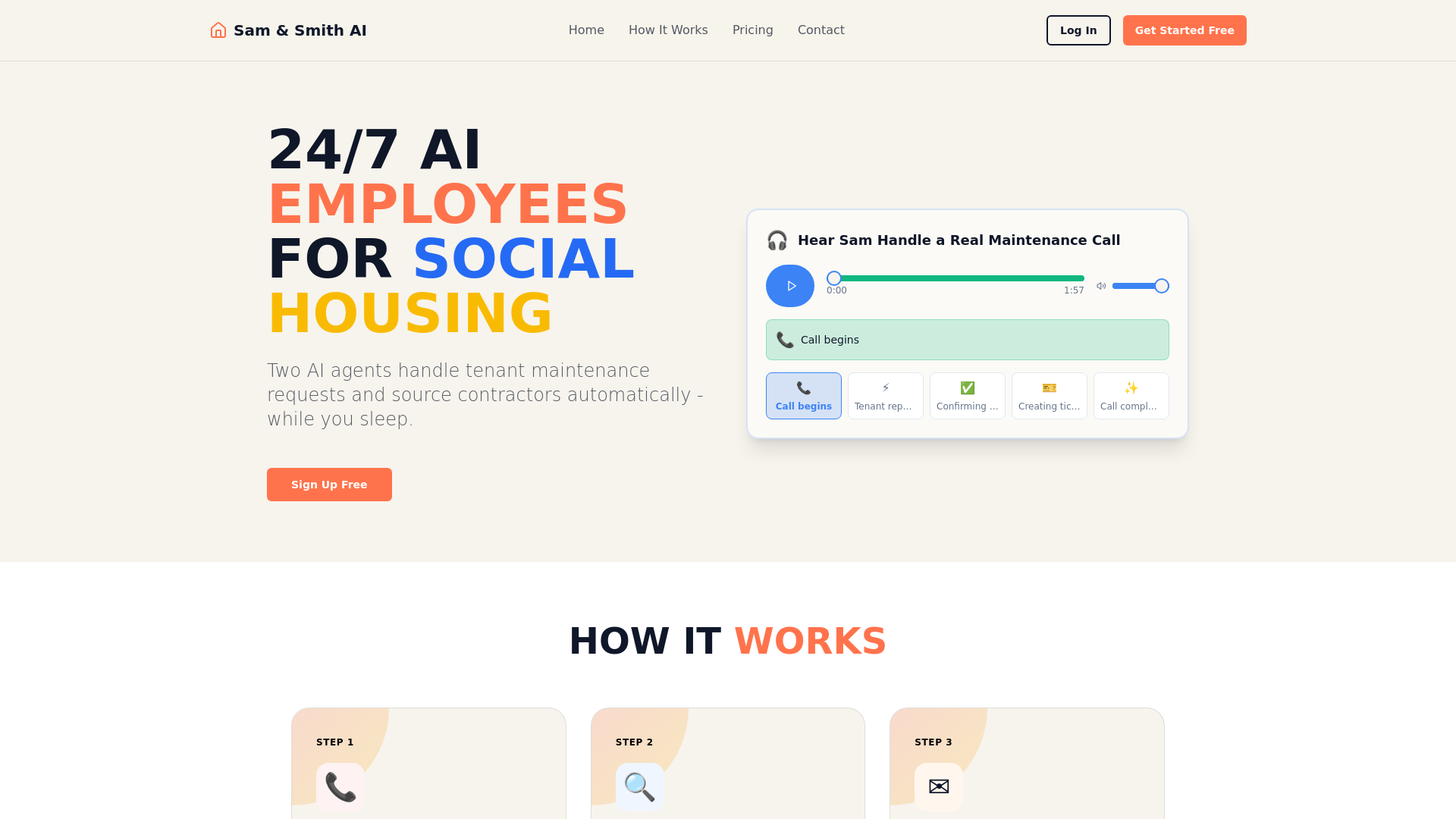 Sam & Smith: Two AI agents managing property maintenance 24/7. Tenants call in any language. Sam logs it instantly. Smith finds contractors in 60 minutes. Built for Global hAIckathon.