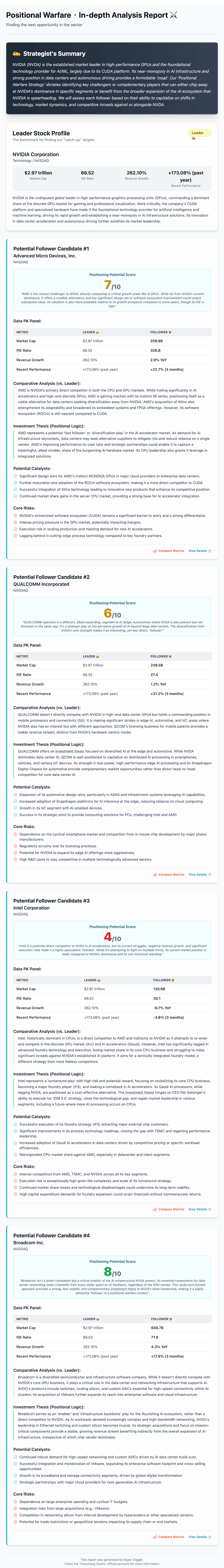3. Supports the “Position Battle” strategy, which analyzes a leading stock you input and searches within the same sector for lower-positioned stocks with the potential to become the next “catch-up leader.” (This is one of my most frequently used strategies.)