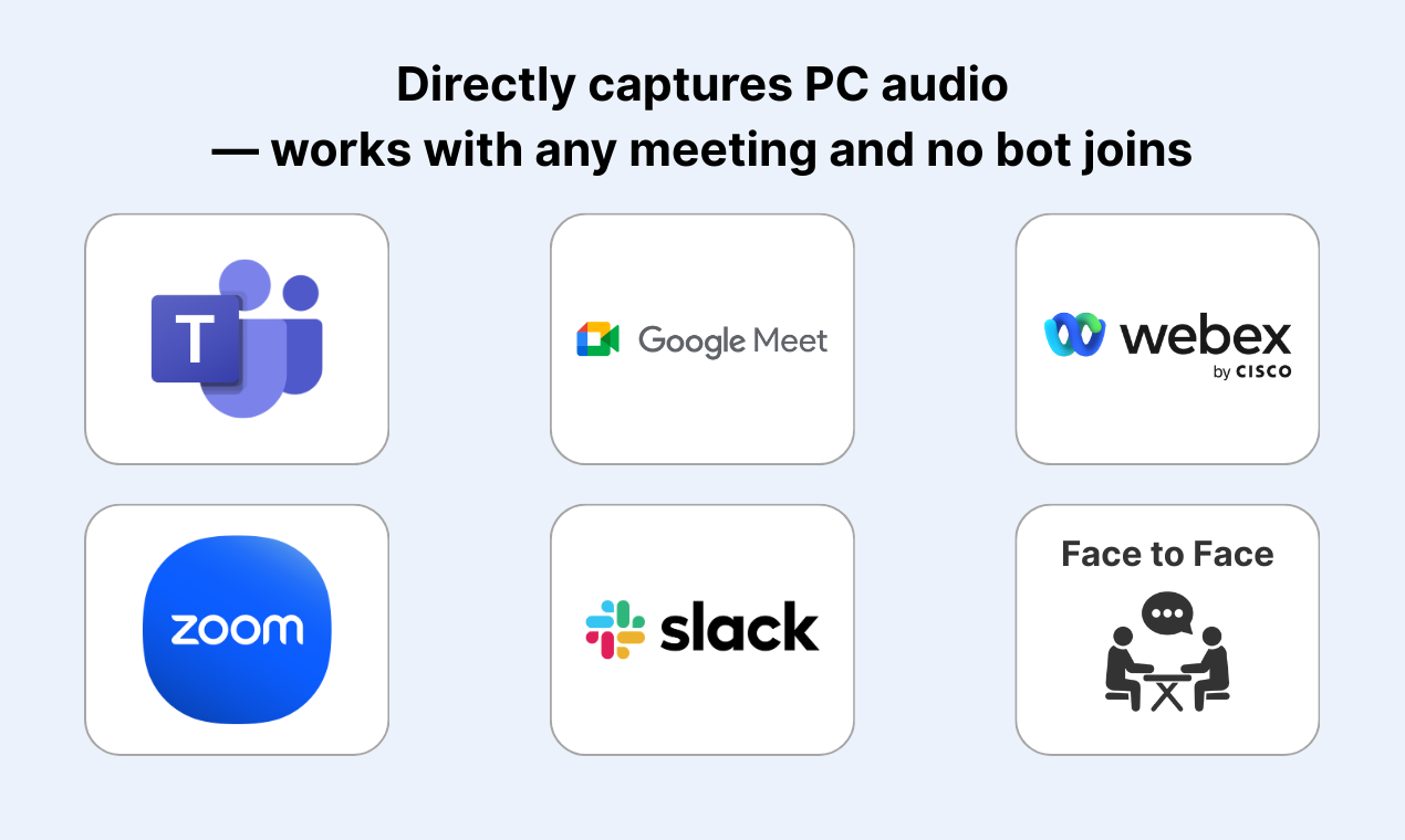 No need to invite a “translation bot” into the call. The desktop app captures system audio directly, so you can use it without other participants noticing.