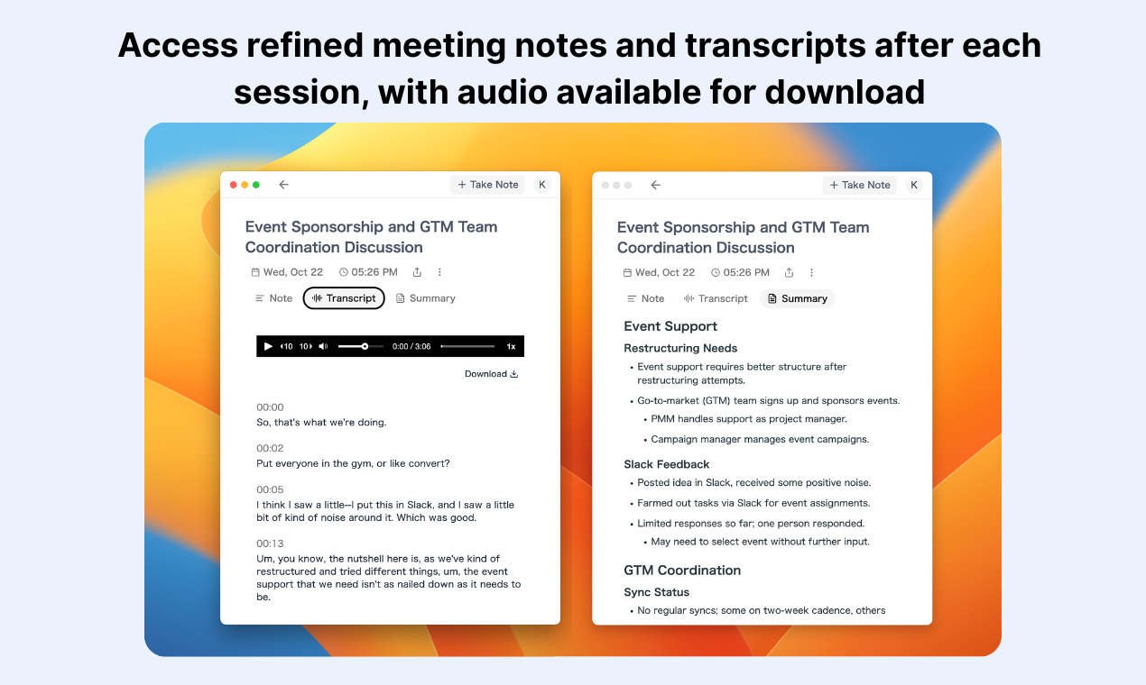 Get a running, real-time summary in your preferred language (e.g. English) while the meeting is still happening, so you never lose the thread.