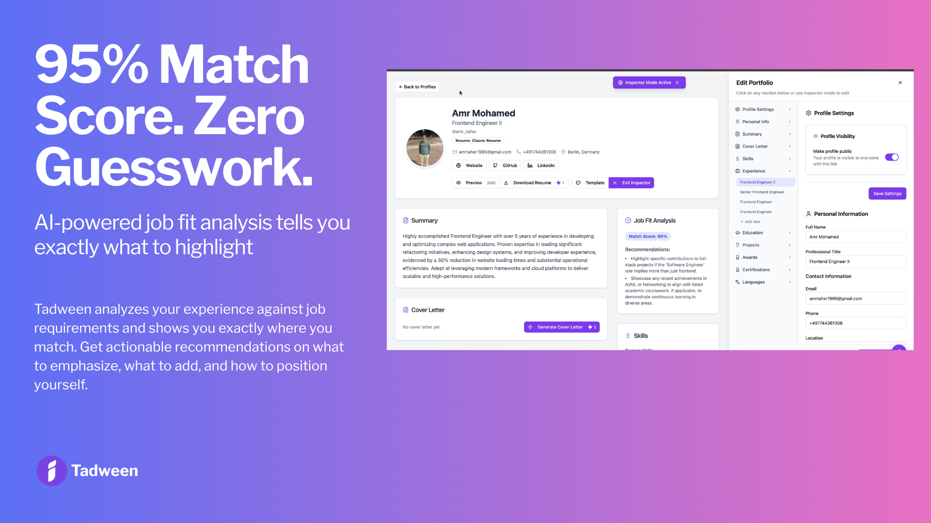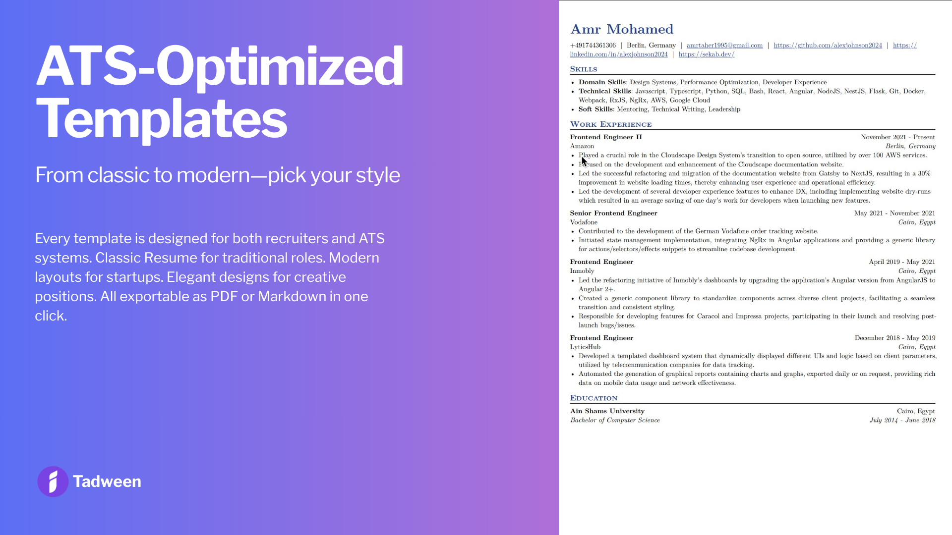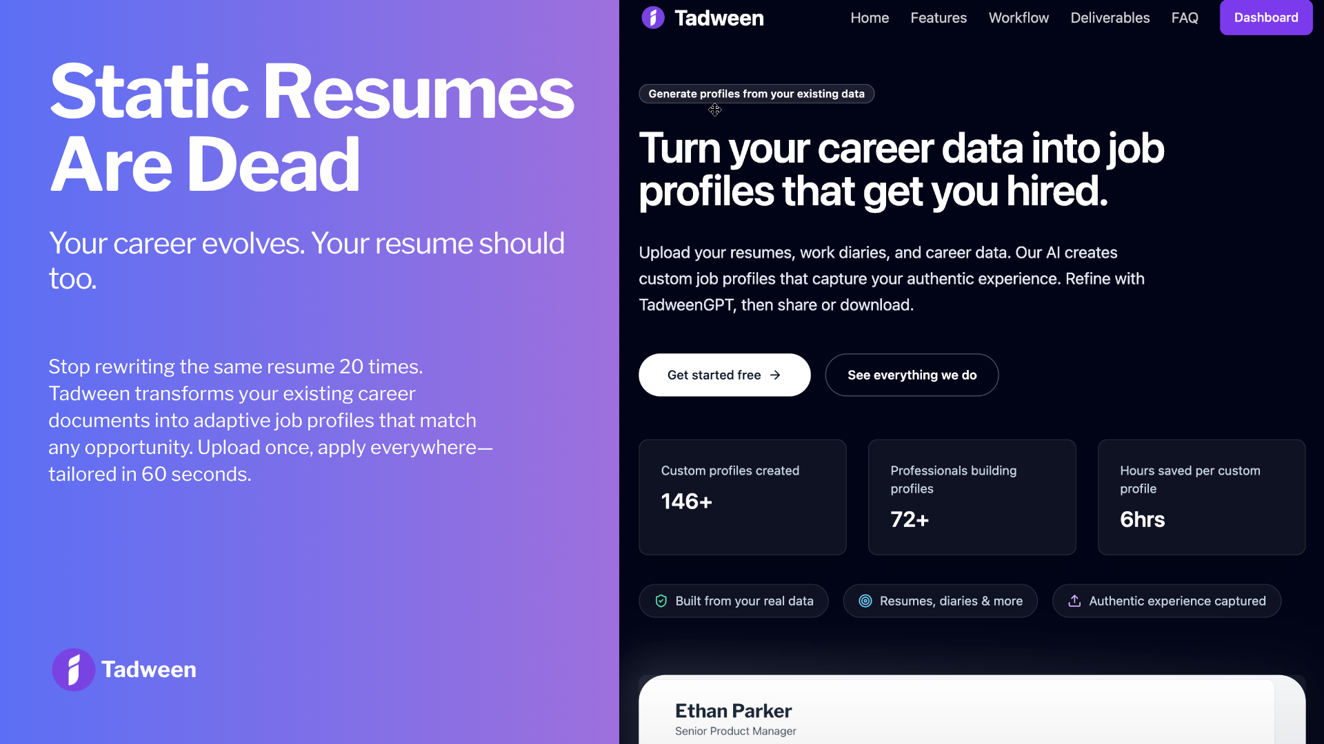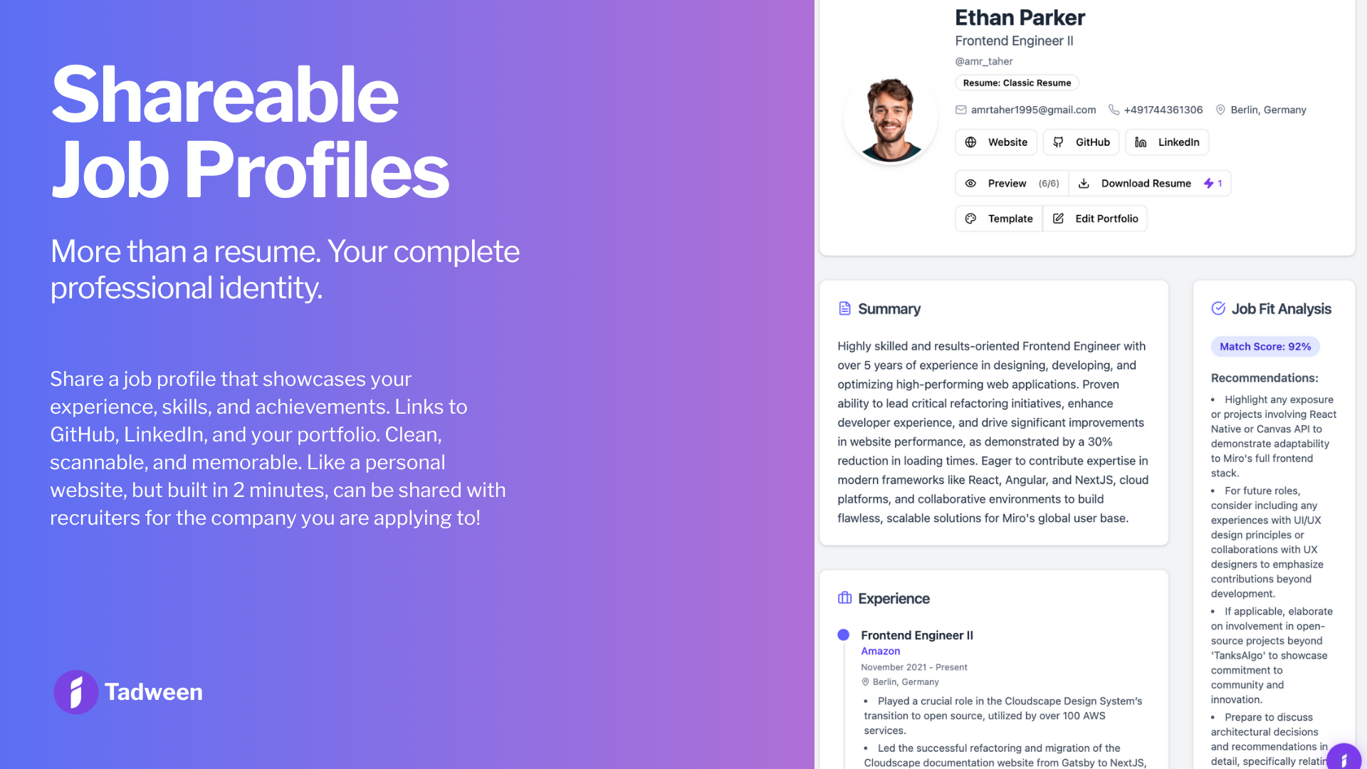 We've both rewritten our resumes 20+ times. Different jobs, different industries, different vibes. Each time felt like starting from scratch. Each time, we thought, "there has to be a better way." And that's why we created Tadween.