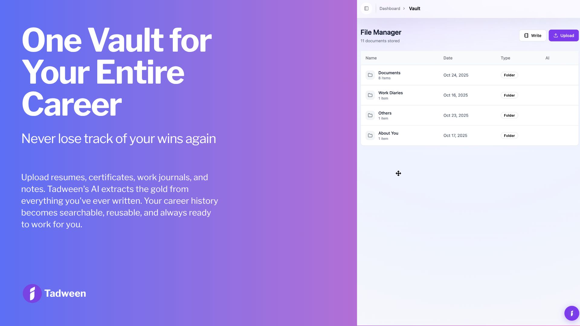 Upload your old resumes, docs, journals, whatever. We extract the good stuff and store it in your Career Vault. Think of it as your professional memory that never forgets a win.