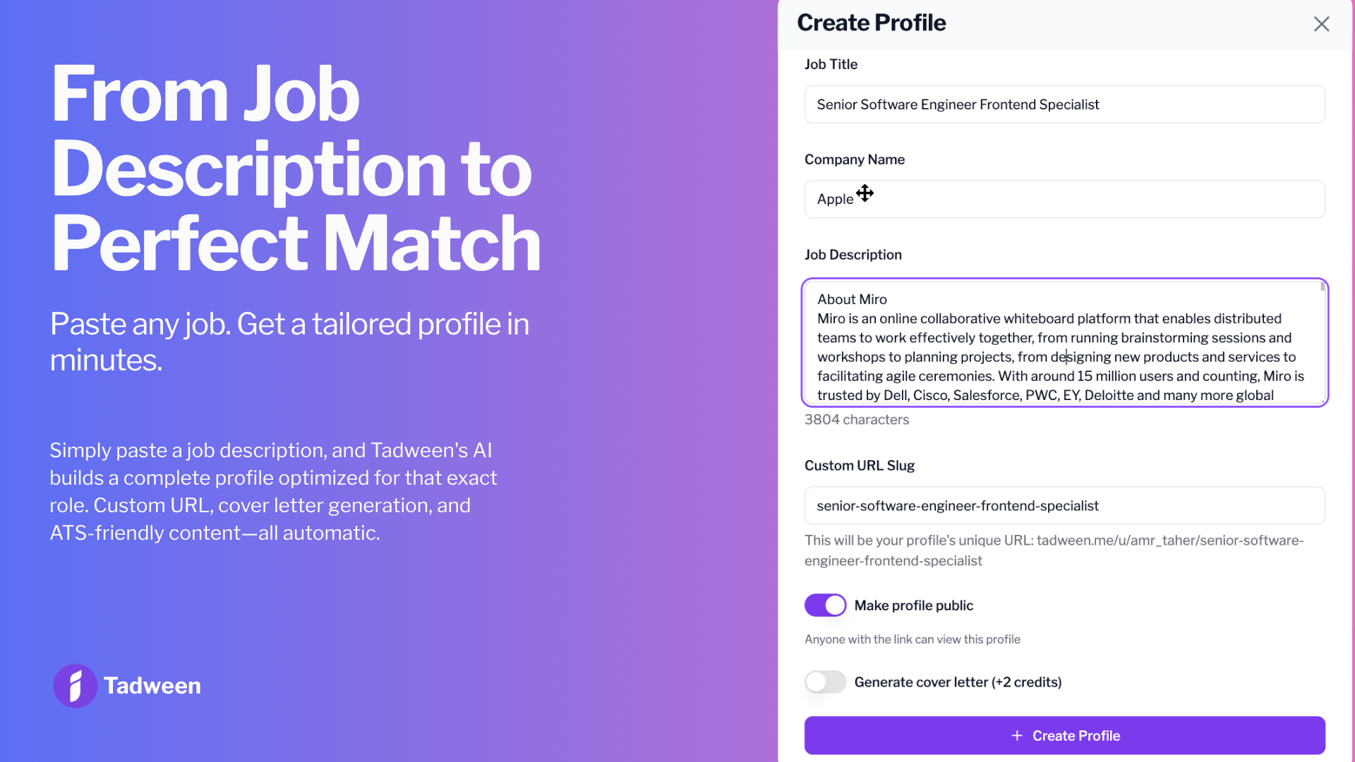 Drop in a job description. Our AI builds a tailored profile that speaks directly to what that role needs. ATS-optimized, recruiter-friendly, ready to go. No blank page. No burnout.