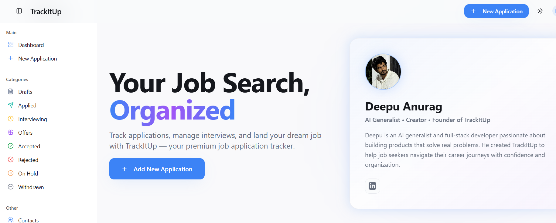 TrackItUp is a clean, modern job application tracker designed to bring clarity to your job search. Track applications, interviews, follow-ups, offers and outcomes in one elegant dashboard. Built with a minimalist and premium UX, TrackItUp helps job seekers stay organized, confident, and in control of their career journey — without messy spreadsheets or chaos.