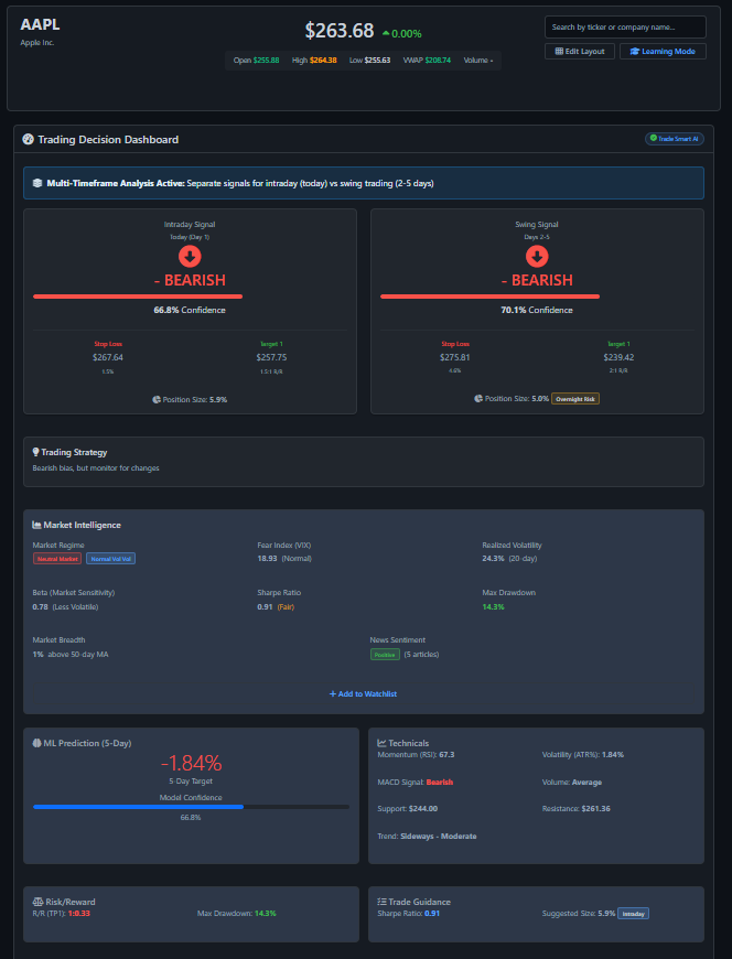 ✅ Every signal shows confidence score, stop-loss, and take-profit