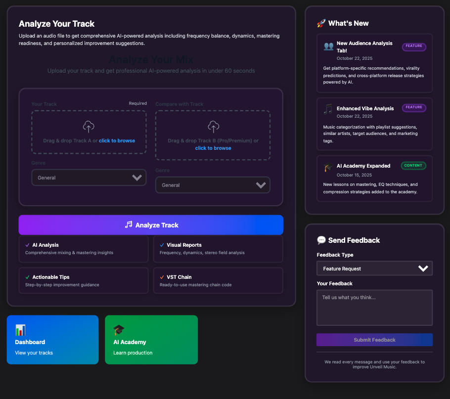 Instant Professional Analysis, Deep Technical Insights, Audience & Virality Predictions, Professional Mastering Tools AI-generated mastering chain recommendations Reference-based mastering with spectral matching, Actionable Improvements DAW Specific mixing recommendations based on AI analysis VST plugin chain suggestions with exact parameters Custom dashboard with 27 draggable analysis widgets Batch analysis - analyze entire albums at once Export to PDF