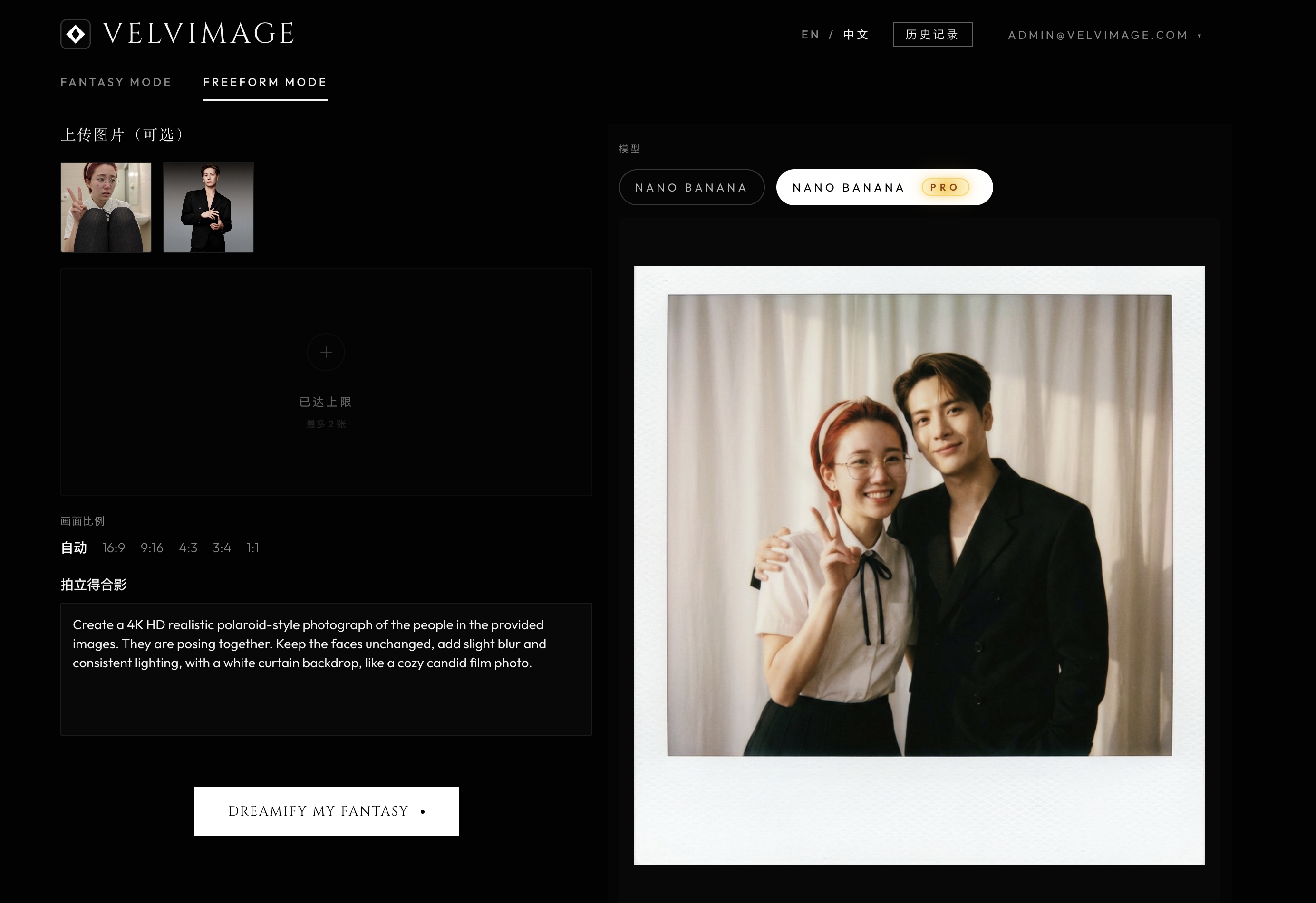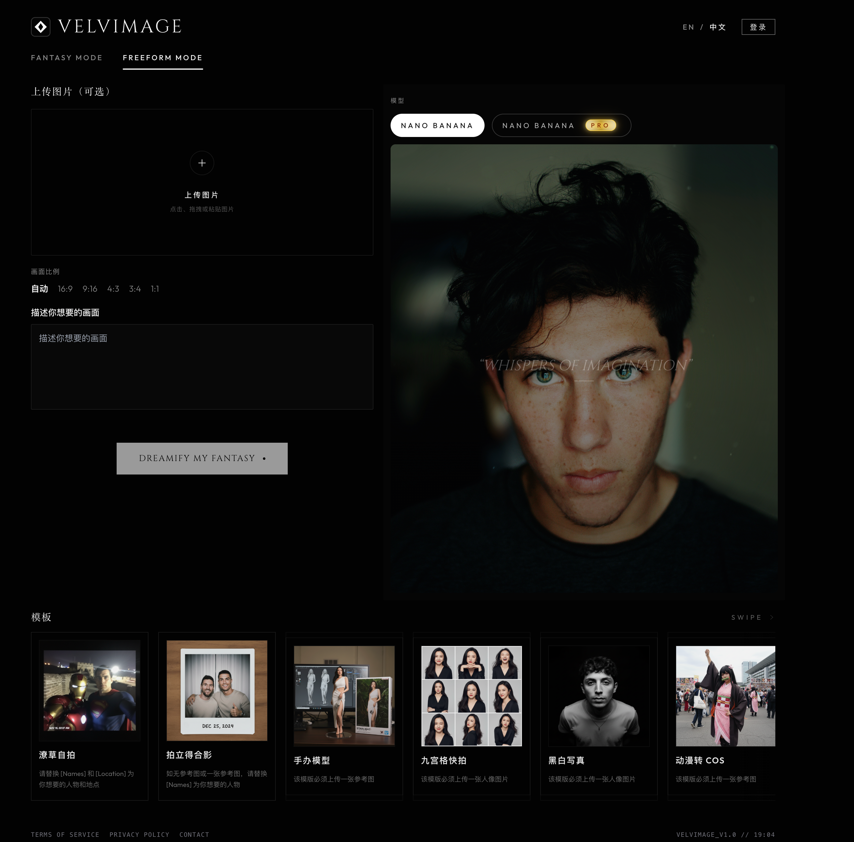 Velvimage is an AI image studio for creators who want more control. You can build stylized portraits, templates (like Polaroid duos, body close‑ups, cosplay outfits), or free-form generations with reference photos. Daily free quotas and a simple credit system keep things fair, Stripe handles top-ups, and Supabase backs the history + moderation. Dual-language UI, prompt preview, and reference upload round out the workflow.