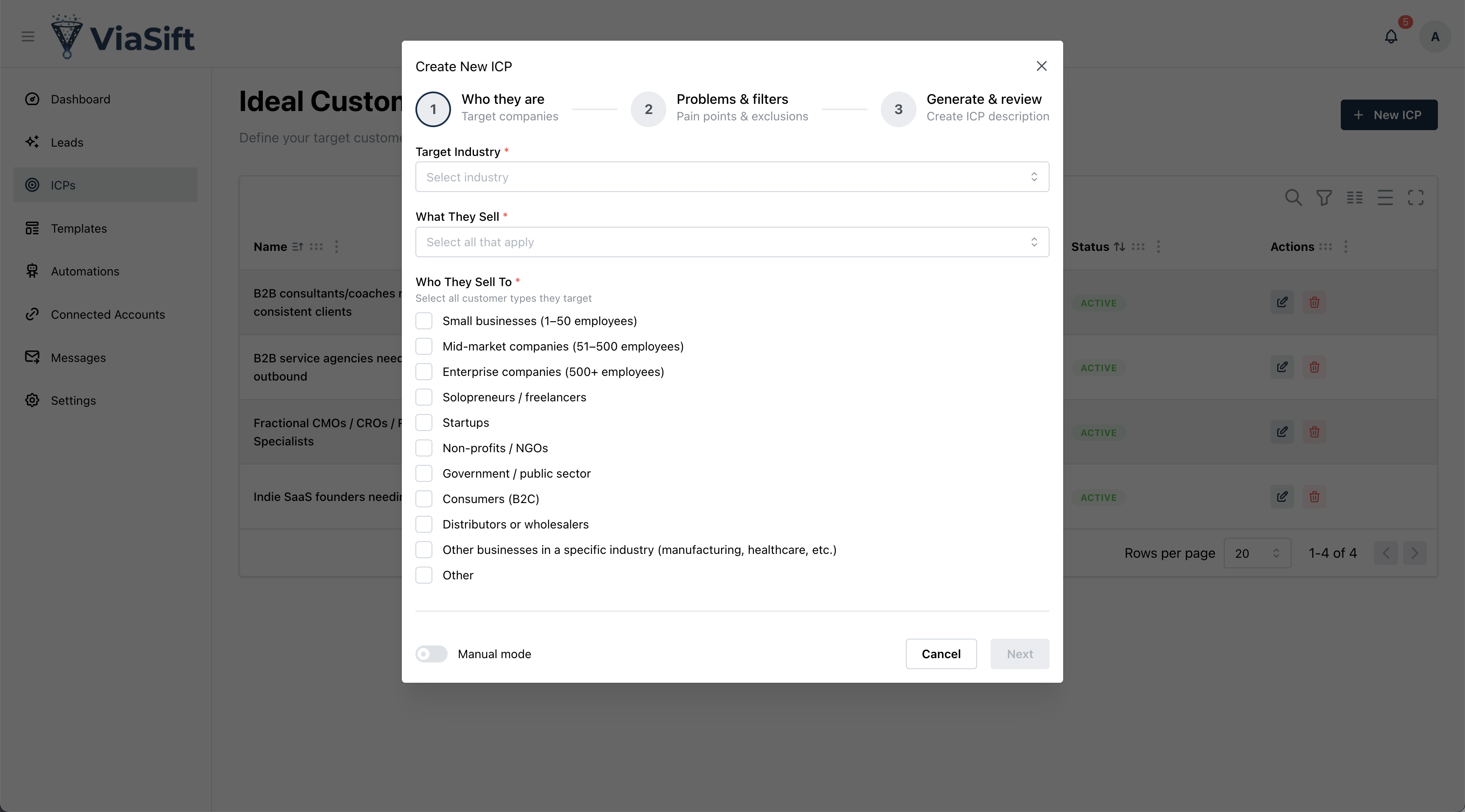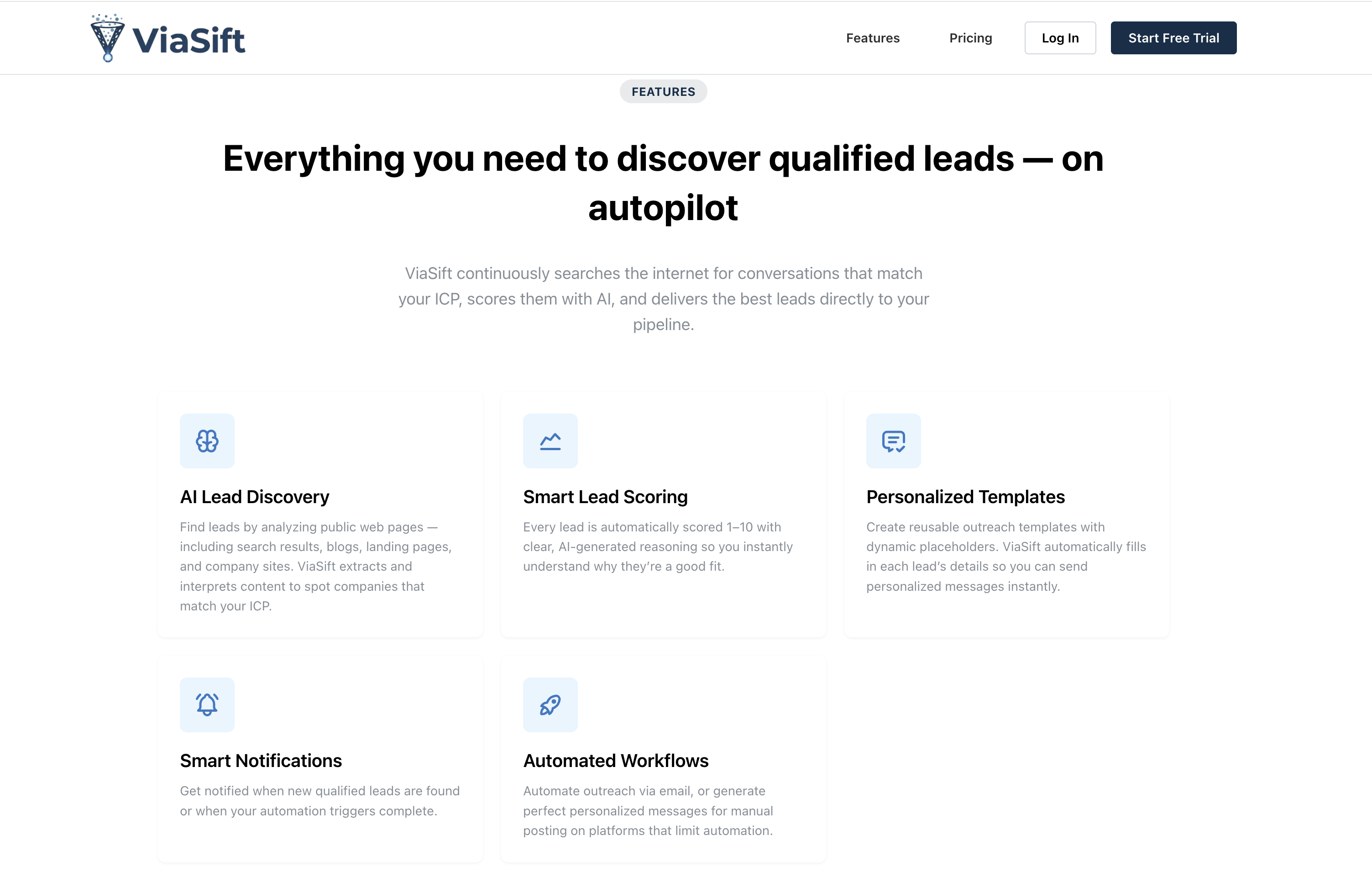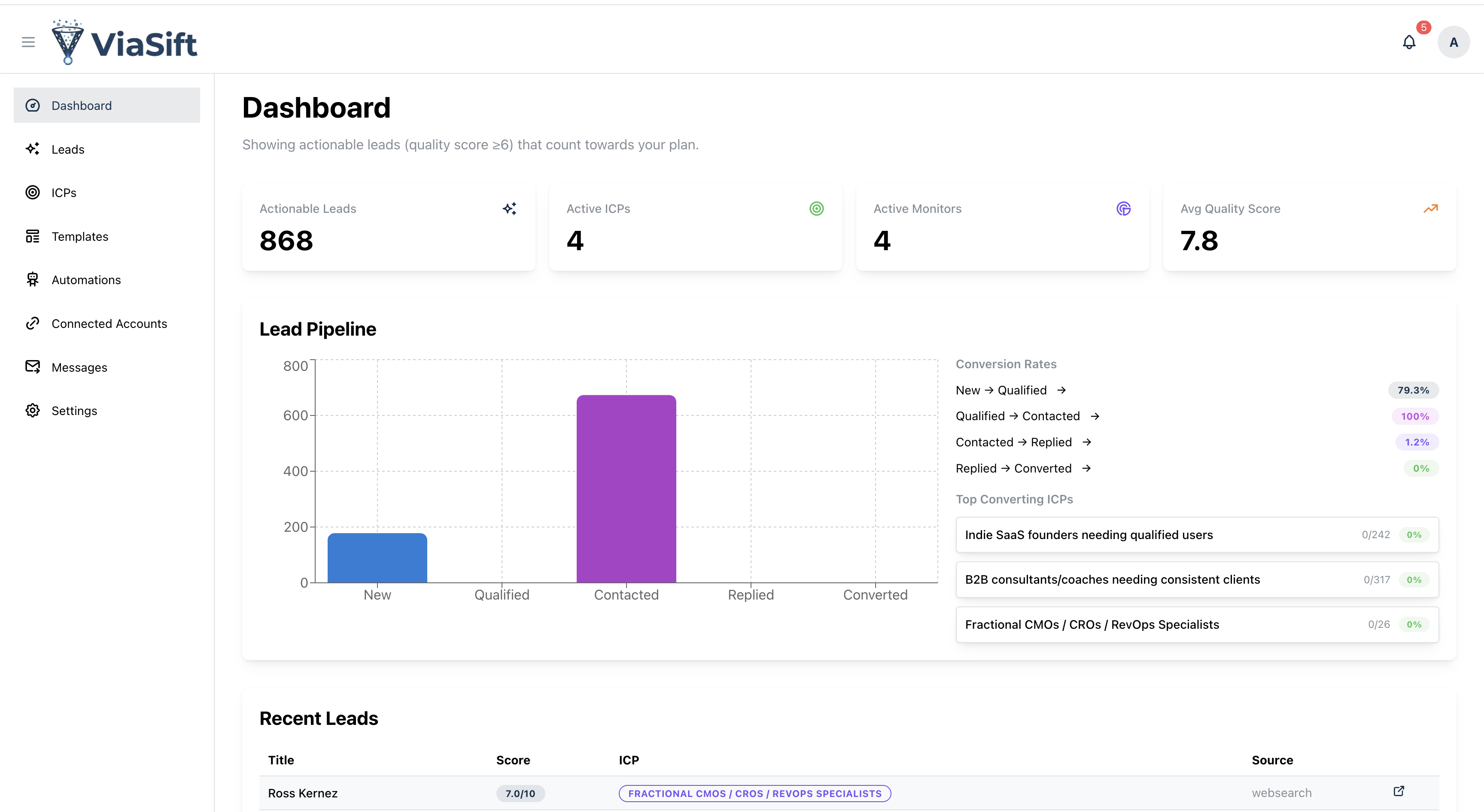 ViaSift continuously analyzes public web pages to find companies that match what you sell, scores them with AI, and delivers the best leads directly to your pipeline.